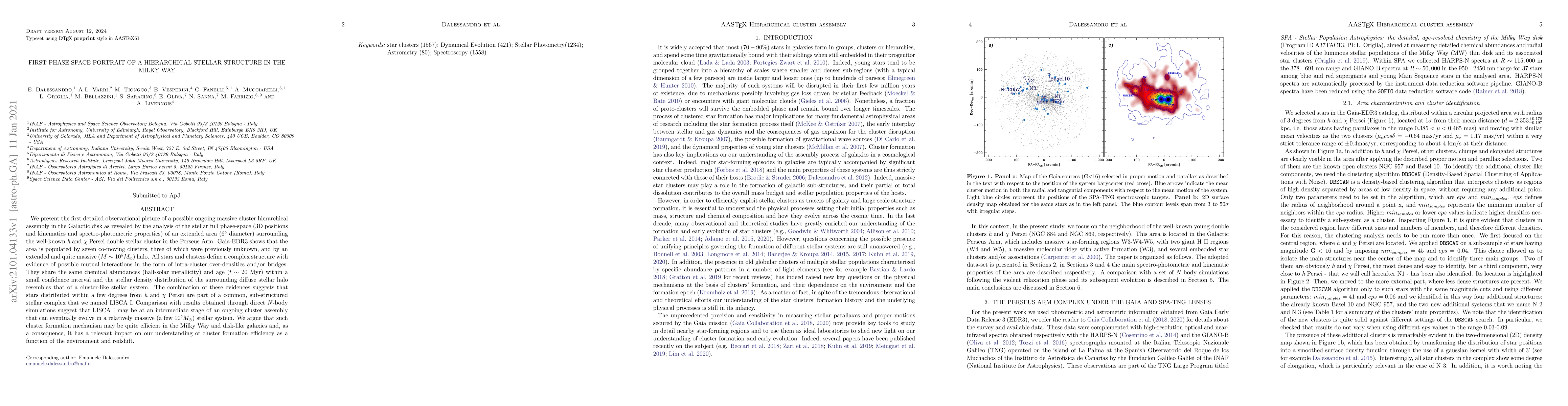 We present the first detailed observational picture of a possible ongoing massive cluster hierarchical assembly in the Galactic disk as revealed by the analysis of the stellar full phase-space (3D positions and kinematics and spectro-photometric properties) of an extended area ($6^{\circ}$ diameter) surrounding the well-known $\it h$ and $\chi$ Persei double stellar cluster in the Perseus Arm. Gaia-EDR3 shows that the area is populated by seven co-moving clusters, three of which were previously unknown, and by an extended and quite massive ($M\sim10^5 M_{\odot}$) halo. All stars and clusters define a complex structure with evidence of possible mutual interactions in the form of intra-cluster over-densities and/or bridges. They share the same chemical abundances (half-solar metallicity) and age ($t\sim20$ Myr) within a small confidence interval and the stellar density distribution of the surrounding diffuse stellar halo resembles that of a cluster-like stellar system. The combination of these evidences suggests that stars distributed within a few degrees from $\it h$ and $\chi$ Persei are part of a common, sub-structured stellar complex that we named LISCA I. Comparison with results obtained through direct $N$-body simulations suggest that LISCA I may be at an intermediate stage of an ongoing cluster assembly that can eventually evolve in a relatively massive (a few $10^5 M_{\odot}$) stellar system. We argue that such cluster formation mechanism may be quite efficient in the Milky Way and disk-like galaxies and, as a consequence, it has a relevant impact on our understanding of cluster formation efficiency as a function of the environment and redshift.