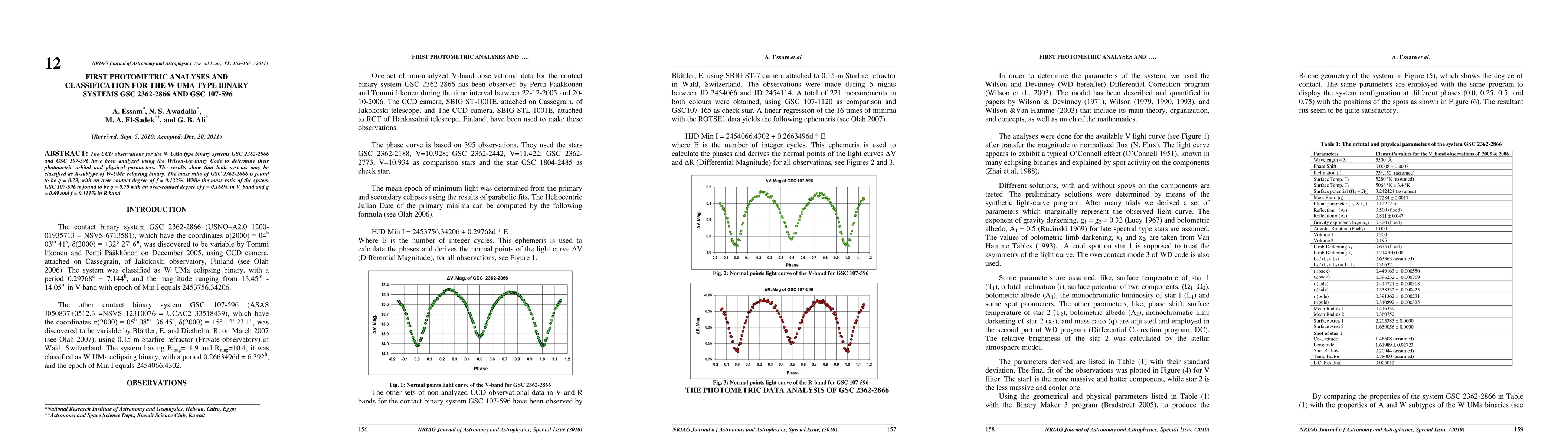 The CCD observations for the W UMa type binary systems GSC 2362-2866 and GSC 107-596 have been analyzed using the Wilson-Devinney Code to determine their photometric orbital and physical parameters. The results show that both systems may be classified as A-subtype of W-UMa eclipsing binary. The mass ratio of GSC 2362-2866 is found to be q = 0.73, with an over-contact degree of f = 0.122%. While the mass ratio of the system GSC 107-596 is found to be q = 0.70 with an over-contact degree of f = 0.166% in V_band and q = 0.69 and f = 0.111% in R band