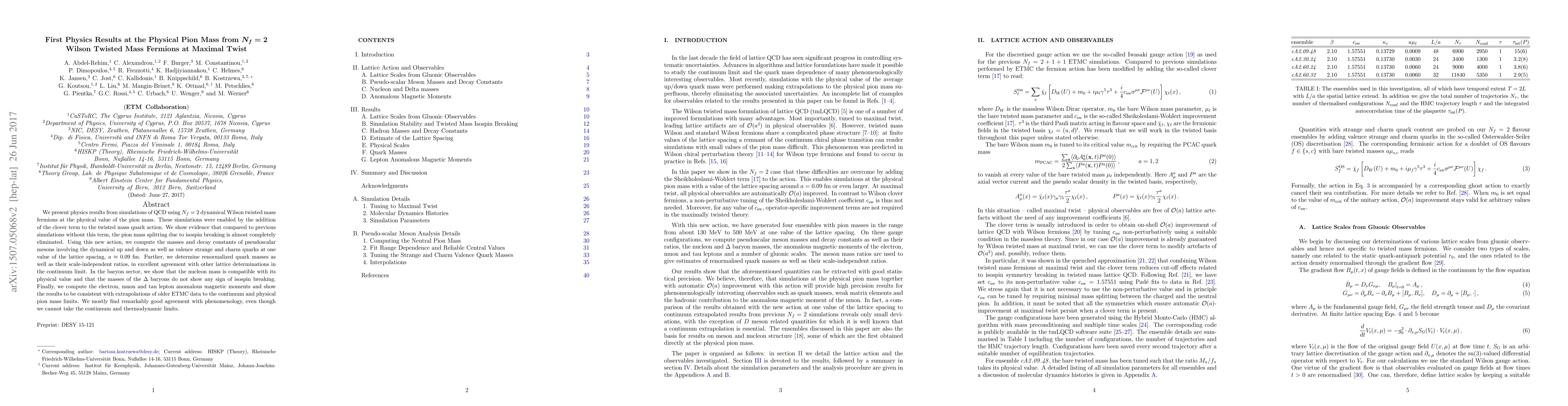 This paper reports on QCD simulations using $N_f = 2$ Wilson twisted mass fermions at the physical pion mass, showing near-complete elimination of pion mass splitting due to isospin breaking. It presents accurate masses and decay constants of pseudoscalar mesons and baryons, and consistent results for lepton anomalous magnetic moments.