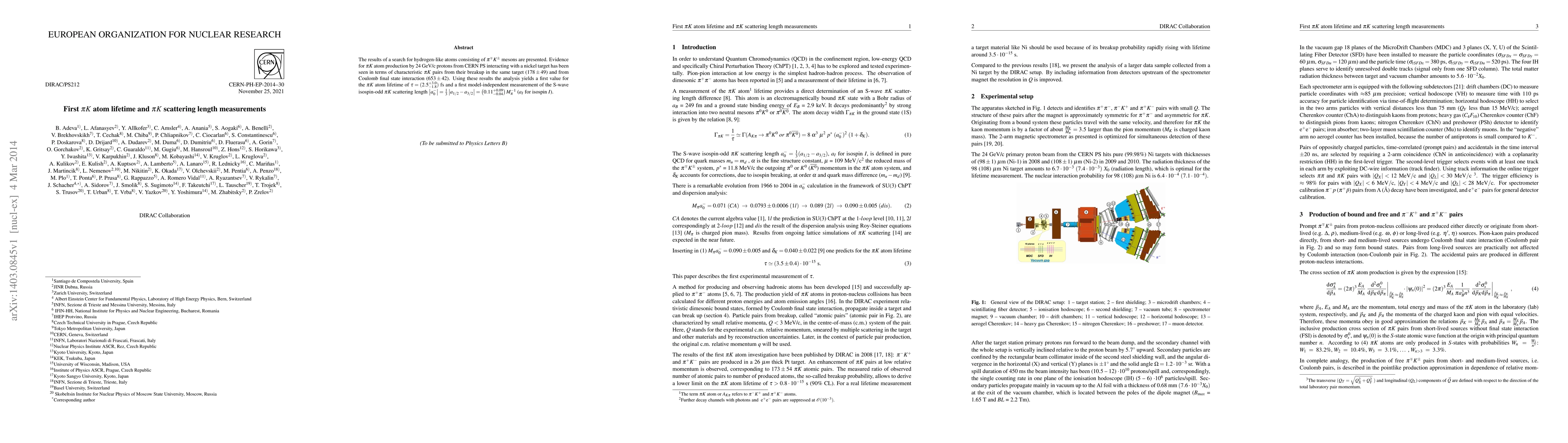 This study reports the first measurements of the lifetime and scattering length for hydrogen-like $\pi K$ atoms, finding a lifetime of $\tau=(2.5_{-1.8}^{+3.0})$ fs and a scattering length of $\left|a_0^-\right|=\left(0.11_{-0.04}^{+0.09} \right)M_{\pi}^{-1}$.