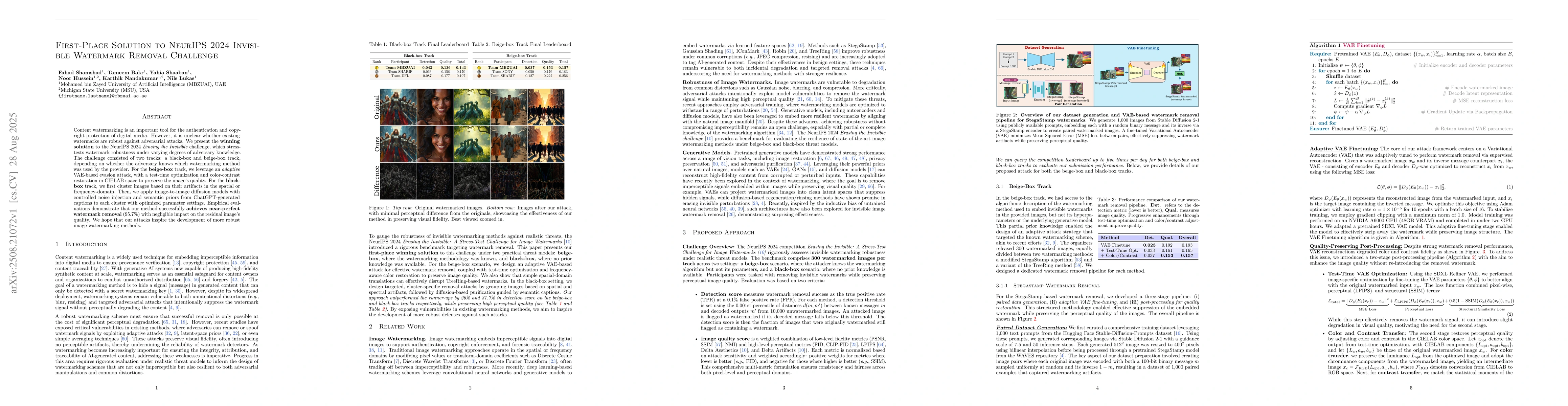Content watermarking is an important tool for the authentication and copyright protection of digital media. However, it is unclear whether existing watermarks are robust against adversarial attacks. We present the winning solution to the NeurIPS 2024 Erasing the Invisible challenge, which stress-tests watermark robustness under varying degrees of adversary knowledge. The challenge consisted of two tracks: a black-box and beige-box track, depending on whether the adversary knows which watermarking method was used by the provider. For the beige-box track, we leverage an adaptive VAE-based evasion attack, with a test-time optimization and color-contrast restoration in CIELAB space to preserve the image's quality. For the black-box track, we first cluster images based on their artifacts in the spatial or frequency-domain. Then, we apply image-to-image diffusion models with controlled noise injection and semantic priors from ChatGPT-generated captions to each cluster with optimized parameter settings. Empirical evaluations demonstrate that our method successfully achieves near-perfect watermark removal (95.7%) with negligible impact on the residual image's quality. We hope that our attacks inspire the development of more robust image watermarking methods.