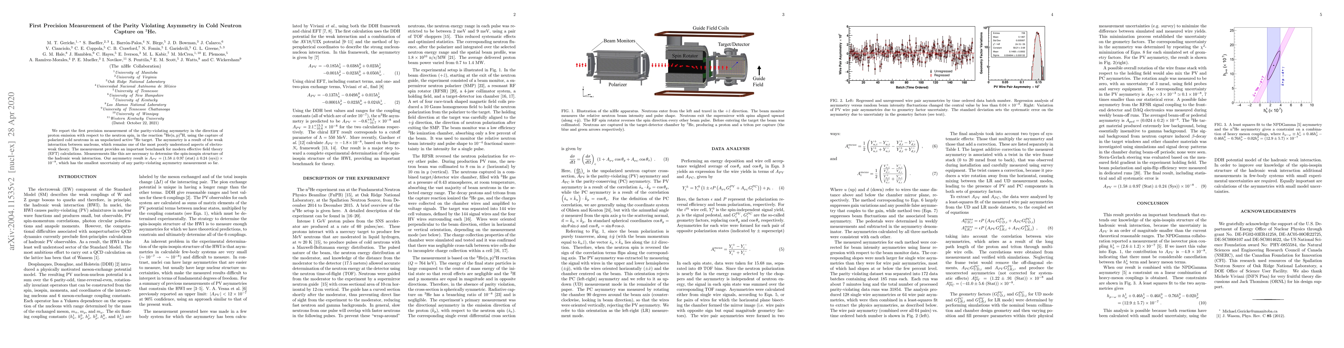 This paper reports the first precise measurement of the parity-violating asymmetry in cold neutron capture on $^3$He, providing a benchmark for effective field theory calculations and contributing to understanding the spin-isospin structure of the hadronic weak interaction. The obtained asymmetry value is $A_{PV} = (1.58 \pm 0.97 \text{ (stat)} \pm 0.24 \text{ (sys)}) \times 10^{-8}$, with the smallest uncertainty to date.