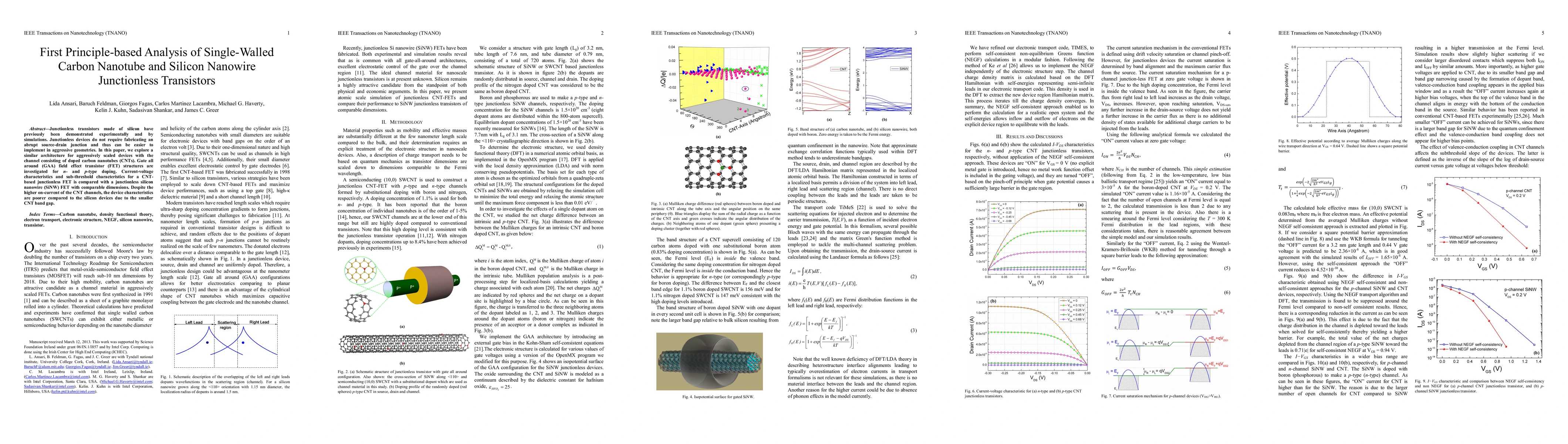 This paper investigates junctionless transistors using single-walled carbon nanotubes (CNTs) versus silicon nanowires (SiNWs), finding that while CNT channels have higher on-current, their device characteristics are inferior due to a smaller band gap compared to silicon.