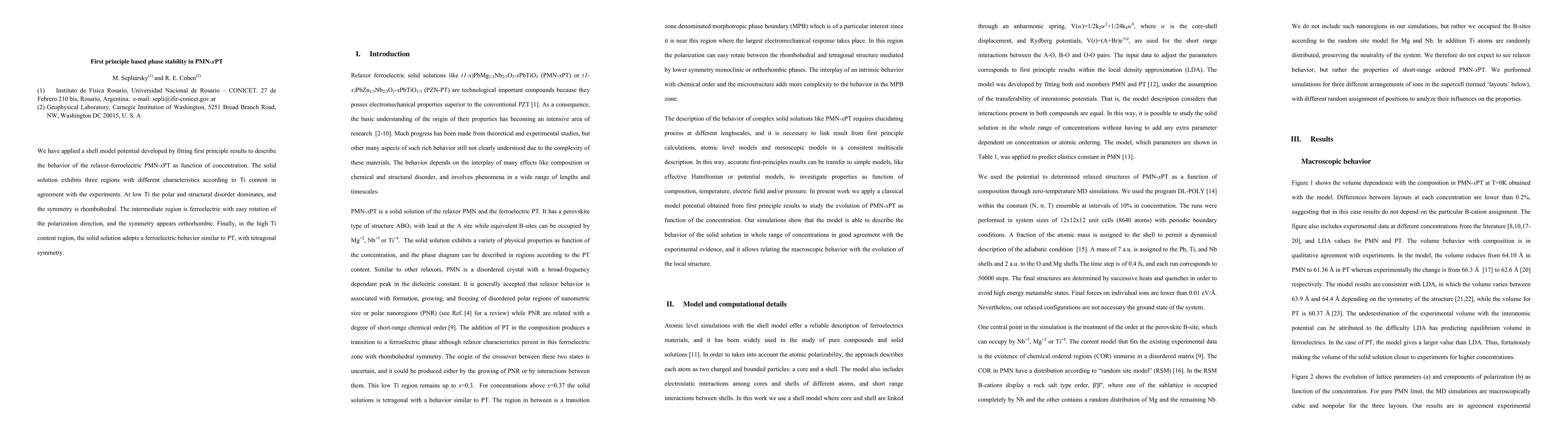 This study uses a shell model potential derived from first-principle calculations to analyze the phase stability of PMN-xPT relaxor-ferroelectric materials, revealing three distinct regions based on Ti concentration: low Ti with rhombohedral symmetry and polar disorder, an intermediate ferroelectric region with orthorhombic symmetry, and a high Ti region with tetragonal ferroelectric behavior.
