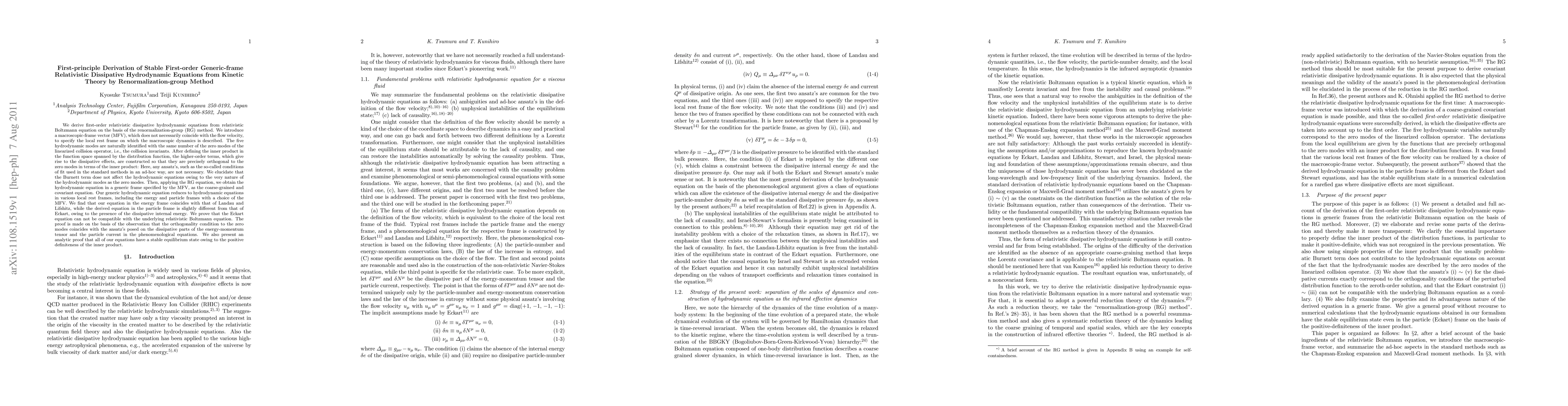 This paper derives first-order relativistic dissipative hydrodynamic equations from the relativistic Boltzmann equation using the renormalization-group method, introducing a macroscopic-frame vector to specify the local rest frame. The authors show that their derived equations are stable and reduce to known forms in specific frames, while proving the incompatibility of the Eckart equation with the underlying kinetic theory.