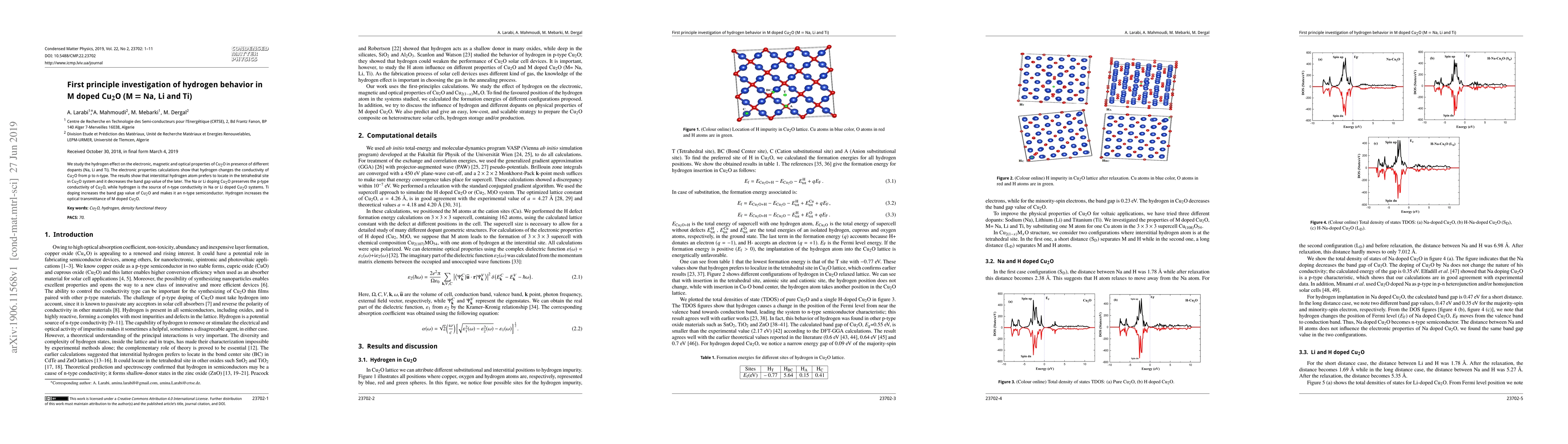 This study investigates how hydrogen affects the electronic, magnetic, and optical properties of Cu$_2$O doped with Na, Li, and Ti. Hydrogen alters Cu$_2$'s conductivity from p-type to n-type, while Na and Li doping maintains p-type conductivity but introduces n-type conductivity via hydrogen. Ti doping increases the band gap and turns Cu$_2$O into an n-type semiconductor, with hydrogen enhancing optical transmittance.