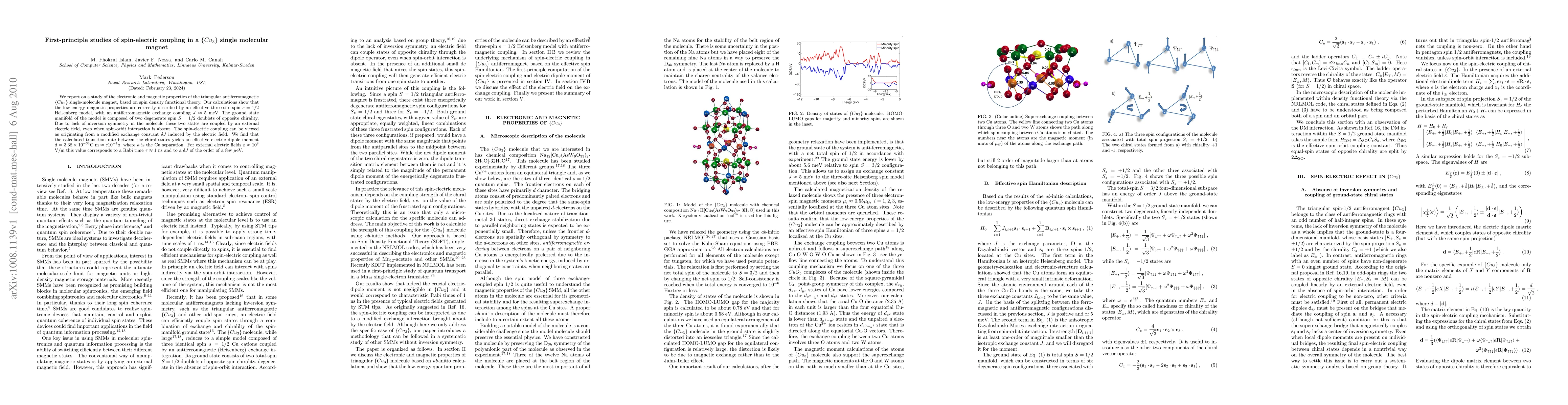 We report on a study of the electronic and magnetic properties of the triangular antiferromagnetic $\{Cu_3\}$ single-molecule magnet, based on spin density functional theory. Our calculations show that the low-energy magnetic properties are correctly described by an effective three-site spin $s=1/2$ Heisenberg model, with an antiferromagnetic exchange coupling $J \approx 5$ meV. The ground state manifold of the model is composed of two degenerate spin $S=1/2$ doublets of opposite chirality. Due to lack of inversion symmetry in the molecule these two states are coupled by an external electric field, even when spin-orbit interaction is absent. The spin-electric coupling can be viewed as originating from a modified exchange constant $\delta J$ induced by the electric field. We find that the calculated transition rate between the chiral states yields an effective electric dipole moment $d = 3.38\times 10^{-33} {\rm C\ m} \approx e 10^{-4}a$, where $a$ is the Cu separation. For external electric fields ${{\varepsilon}} \approx 10^8$ V/m this value corresponds to a Rabi time $\tau \approx 1$ ns and to a $\delta J$ of the order of a few $\mu$eV.