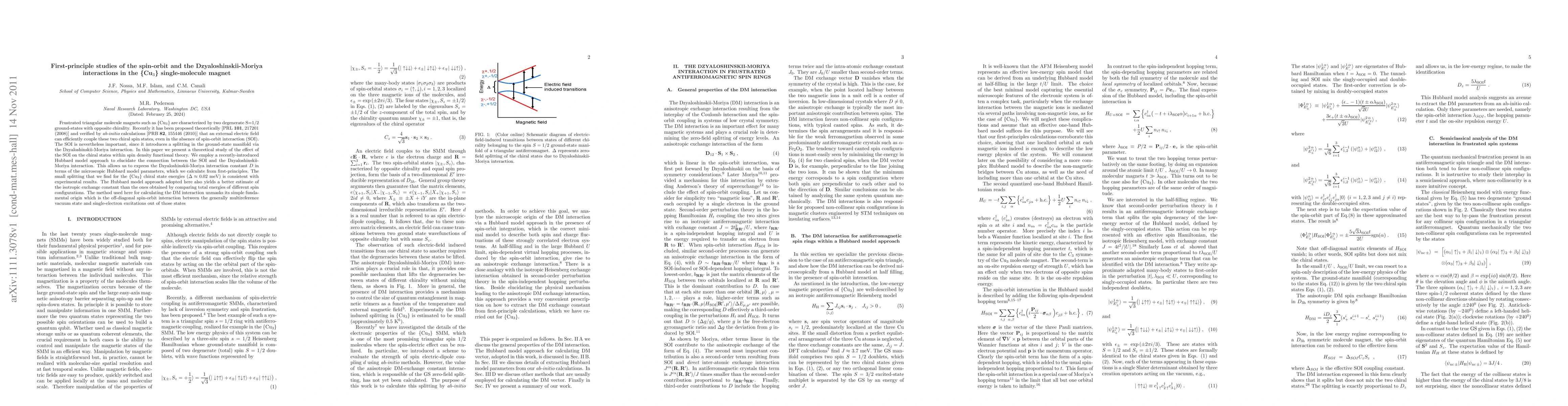This paper investigates the spin-orbit interaction (SOI) and Dzyaloshinskii-Moriya interaction in the \{Cu$_3$\} single-molecule magnet using first-principles calculations. The study reveals a small ground-state splitting and provides a Hubbard model approach to better estimate the Dzyaloshinskii-Moriya interaction constant.