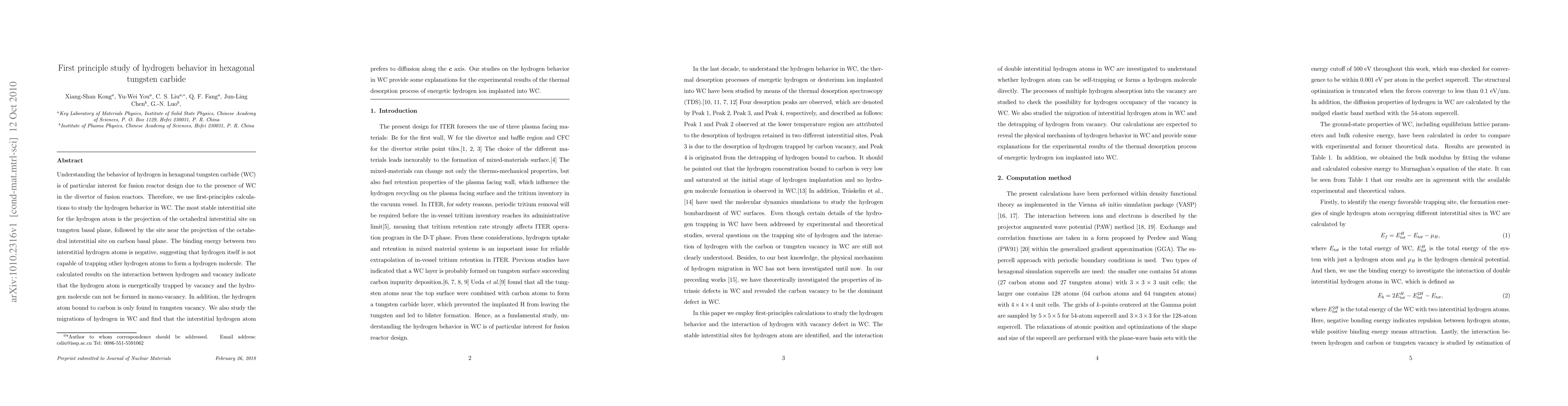 This paper uses first-principles calculations to investigate hydrogen behavior in hexagonal tungsten carbide (WC), finding the most stable hydrogen site is on the tungsten basal plane. The study shows hydrogen atoms are trapped by vacancies and do not form molecules, with hydrogen migration favoring the c axis.