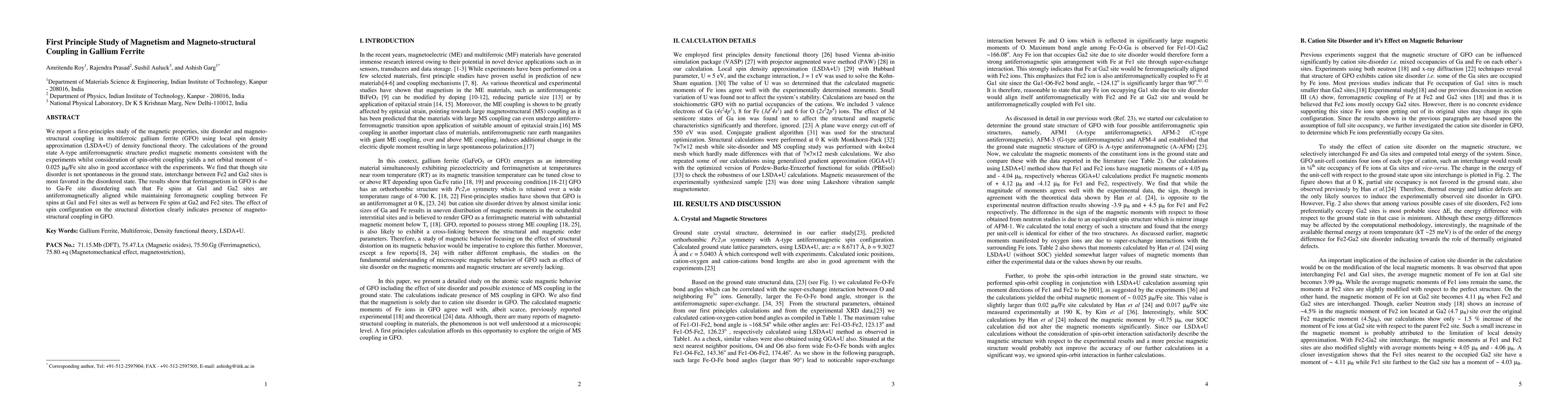 We report a first-principles study of the magnetic properties, site disorder and magneto-structural coupling in multiferroic gallium ferrite (GFO) using local spin density approximation (LSDA+U) of density functional theory. The calculations of the ground state A-type antiferromagnetic structure predict magnetic moments consistent with the experiments whilst consideration of spin-orbit coupling yields a net orbital moment of ~ 0.025 Bohr magneton/Fe site also in good accordance with the experiments. We find that though site disorder is not spontaneous in the ground state, interchange between Fe2 and Ga2 sites is most favored in the disordered state. The results show that ferrimagnetism in GFO is due to Ga-Fe site disordering such that Fe spins at Ga1 and Ga2 sites are antiferromagnetically aligned while maintaining ferromagnetic coupling between Fe spins at Ga1 and Fe1 sites as well as between Fe spins at Ga2 and Fe2 sites. The effect of spin configuration on the structural distortion clearly indicates presence of magneto-structural coupling in GFO.