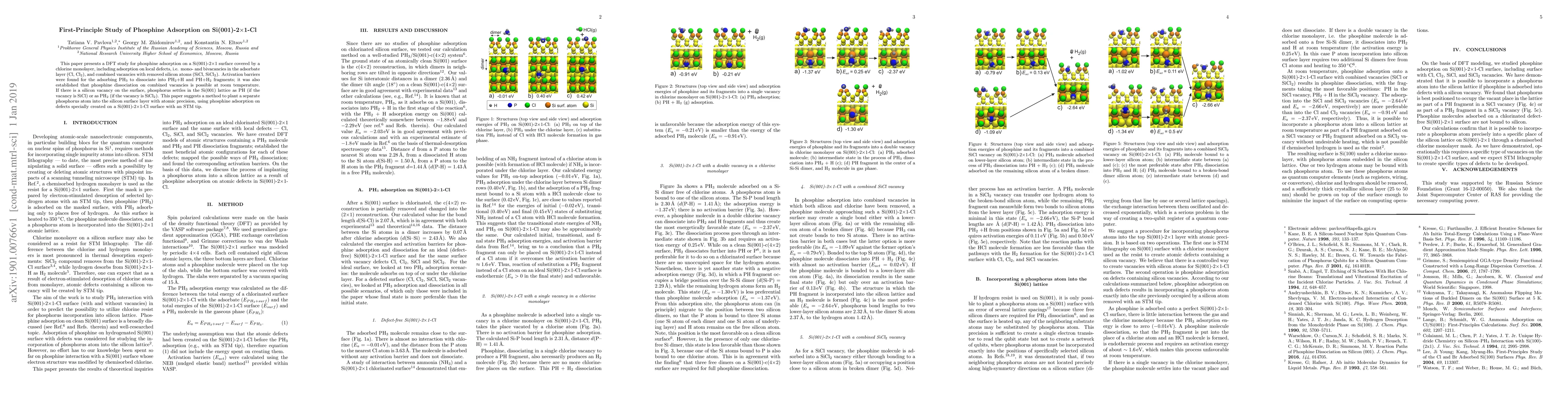This paper presents a DFT study for phosphine adsorption on a Si(001)-2$\times$1 surface covered by a chlorine monolayer, including adsorption on local defects, i.e. mono- and bivacancies in the adsorbate layer (Cl, Cl$_2$), and combined vacancies with removed silicon atoms (SiCl, SiCl$_2$). Activation barriers were found for the adsorbing PH$_3$ to dissociate into PH$_2$+H and PH+H$_2$ fragments; it was also established that phosphine dissociation on combined vacancies is possible at room temperature. If there is a silicon vacancy on the surface, phosphorus settles in the Si(001) lattice as PH (if the vacancy is SiCl) or as PH$_2$ (if the vacancy is SiCl$_2$). This paper suggests a method to plant a separate phosphorus atom into the silicon surface layer with atomic precision, using phosphine adsorption on defects specially created on a Si(001)-2$\times$1-Cl surface with an STM tip.
