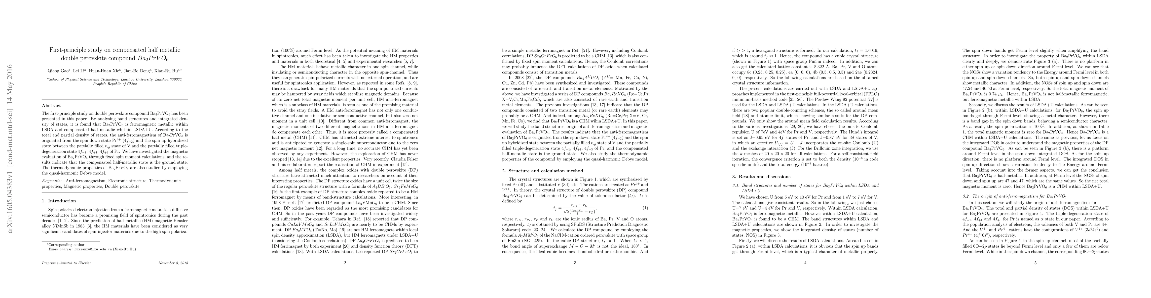 The first-principle study on double perovskite compound Ba$_2$PrVO$_6$ has been presented in this paper. By analysing band structures and integrated density of states, it is found that Ba$_2$PrVO$_6$ is ferromagnetic metallic within LSDA and compensated half metallic whithin LSDA+U. According to the total and partial density of states, the anti-ferromagnetism of Ba$_2$PrVO$_6$ is originated from the spin down state Pr$^{4+}$ ($4f_{-2}$) and the spin up hybridized state between the partially filled $t_{2g}$ state of V and the partially filled triple-degeneration state $4f_{-1}$, $4f_{+1}$, $4f_{+3}$ of Pr. We have investigated the magnetic evaluation of Ba$_2$PrVO$_6$ through fixed spin moment calculations, and the results indicate that the compensated half-metallic state is the ground state. The thermodynamic properties of Ba$_2$PrVO$_6$ are also studied by employing the quasi-harmonic Debye model.