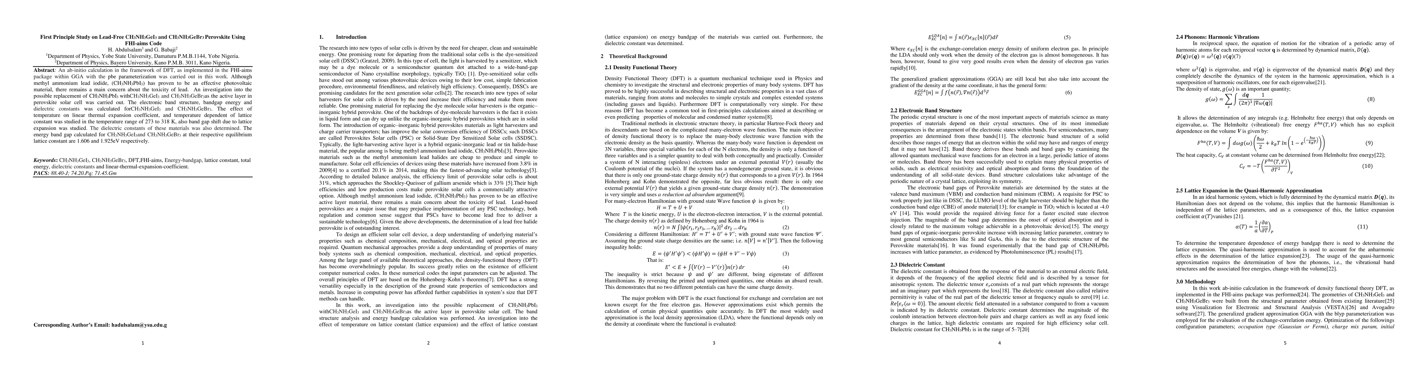 An ab-initio calculation in the framework of DFT, as implemented in the FHI-aims package within GGA with the pbe parameterization was carried out in this work. Although methyl ammonium lead iodide, (CH3NH3PbI3) has proven to be an effective photovoltaic material, there remains a main concern about the toxicity of lead. An investigation into the possible replacement of CH3NH3PbI3 withCH3NH3GeI3 and CH3NH3GeBr3as the active layer in perovskite solar cell was carried out. The electronic band structure, bandgap energy and dielectric constants was calculated forCH3NH3GeI3 and CH3NH3GeBr3. The effect of temperature on linear thermal expansion coefficient, and temperature dependent of lattice constant was studied in the temperature range of 273 to 318 K, also band gap shift due to lattice expansion was studied. The dielectric constants of these materials was also determined. The energy band gap calculated for CH3NH3GeI3and CH3NH3GeBr3 at their respective equilibrium lattice constant are 1.606 and 1.925eV respectively.