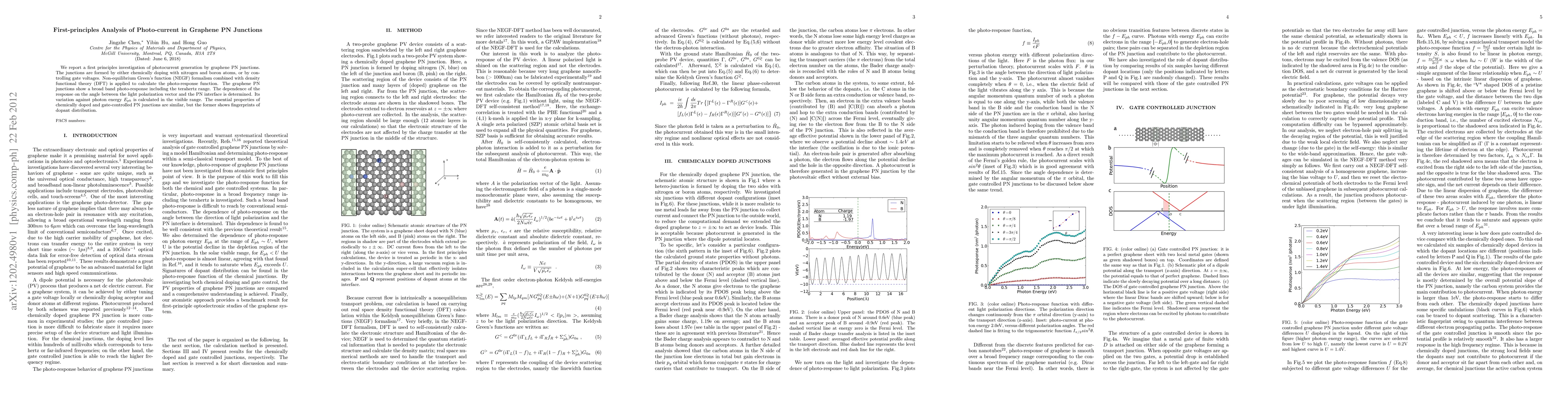 This study investigates the photocurrent generation in graphene PN junctions using first-principles calculations based on density functional theory and non-equilibrium Green's function formalism. The research reveals that both chemically doped and gate-controlled PN junctions exhibit broad photo-responses, including the terahertz range, with similar essential properties but distinct dopant distribution fingerprints.