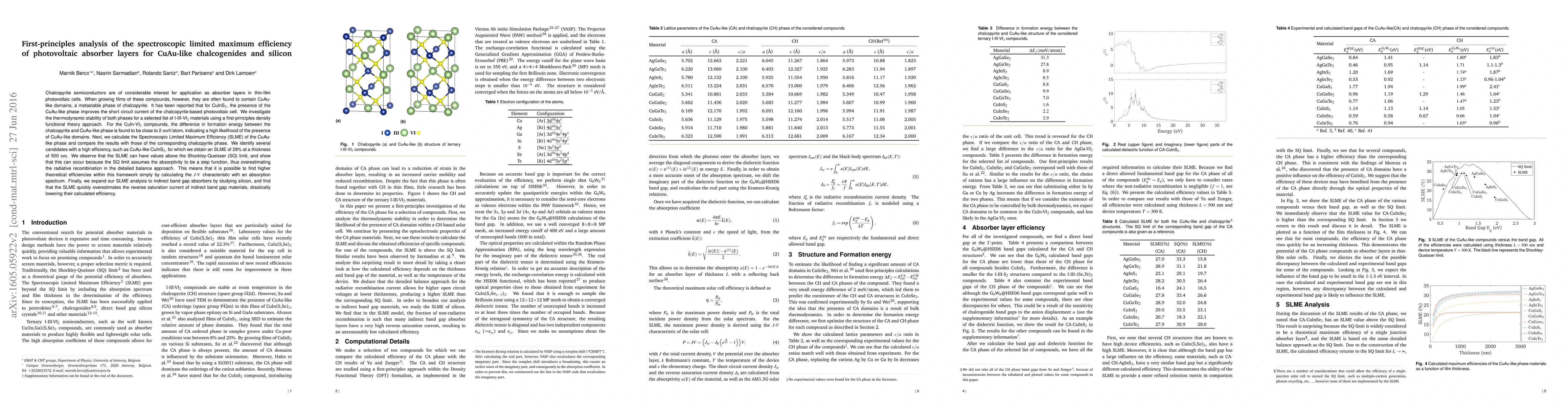 Chalcopyrite semiconductors are of considerable interest for application as absorber layers in thin-film photovoltaic cells. When growing films of these compounds, however, they are often found to contain CuAu- like domains, a metastable phase of chalcopyrite. It has been reported that for CuInS2, the presence of the CuAu-like phase improves the short circuit current of the chalcopyrite-based photovoltaic cell. We investigate the thermodynamic stability of both phases for a selected list of I-III-VI2 materials using a first-principles density functional theory approach. For the CuIn-VI2 compounds, the difference in formation energy between the chalcopyrite and CuAu-like phase is found to be close to 2 meV/atom, indicating a high likelihood of the presence of CuAu-like domains. Next, we calculate the Spectroscopic Limited Maximum Efficiency (SLME) of the CuAu- like phase and compare the results with those of the corresponding chalcopyrite phase. We identify several candidates with a high efficiency, such as CuAu-like CuInS2, for which we obtain an SLME of 29% at a thickness of 500 nm. We observe that the SLME can have values above the Shockley-Queisser (SQ) limit, and show that this can occur because the SQ limit assumes the absorptivity to be a step function, thus overestimating the radiative recombination in the detailed balance approach. This means that it is possible to find higher theoretical efficiencies within this framework simply by calculating the J-V characteristic with an absorption spectrum. Finally, we expand our SLME analysis to indirect band gap absorbers by studying silicon, and find that the SLME quickly overestimates the reverse saturation current of indirect band gap materials, drastically lowering their calculated efficiency.