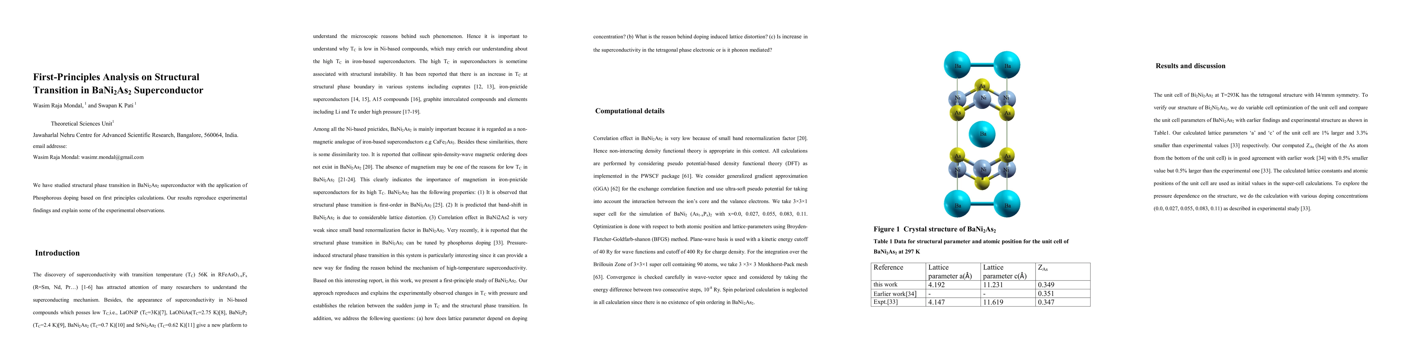 Summary: This study employs first-principles calculations to investigate the structural phase transition in BaNi2As2 superconductor induced by phosphorous doping, successfully reproducing experimental findings and providing insights into the underlying mechanisms.