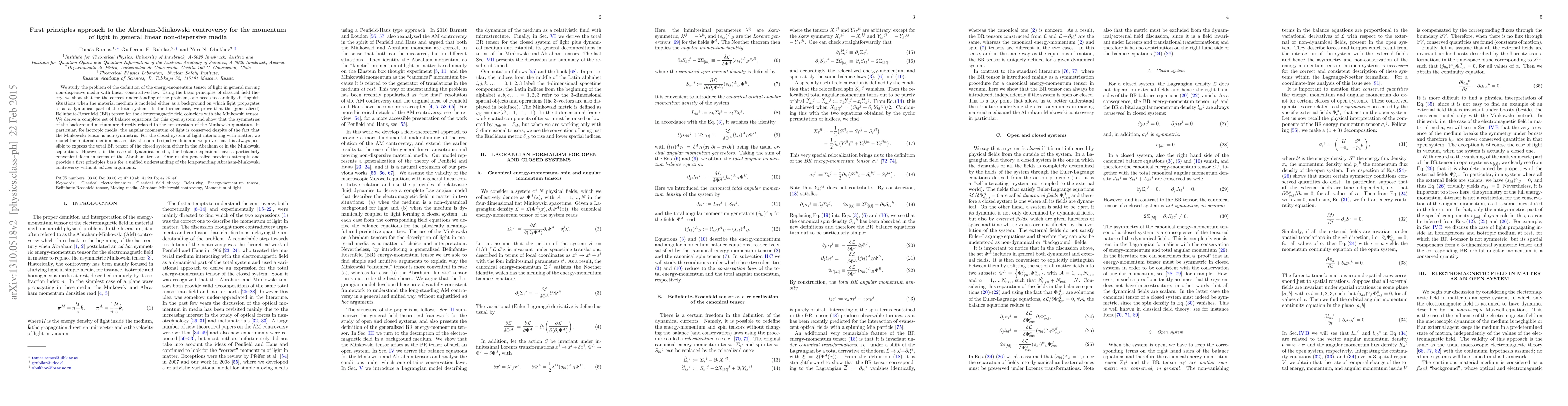 We study the problem of the definition of the energy-momentum tensor of light in general moving non-dispersive media with linear constitutive law. Using the basic principles of classical field theory, we show that for the correct understanding of the problem, one needs to carefully distinguish situations when the material medium is modeled either as a background on which light propagates or as a dynamical part of the total system. In the former case, we prove that the (generalized) Belinfante-Rosenfeld (BR) tensor for the electromagnetic field coincides with the Minkowski tensor. We derive a complete set of balance equations for this open system and show that the symmetries of the background medium are directly related to the conservation of the Minkowski quantities. In particular, for isotropic media, the angular momentum of light is conserved despite of the fact that the Minkowski tensor is non-symmetric. For the closed system of light interacting with matter, we model the material medium as a relativistic non-dissipative fluid and we prove that it is always possible to express the total BR tensor of the closed system either in the Abraham or in the Minkowski separation. However, in the case of dynamical media, the balance equations have a particularly convenient form in terms of the Abraham tensor. Our results generalize previous attempts and provide a first principles basis for a unified understanding of the long-standing Abraham-Minkowski controversy without ad hoc arguments.