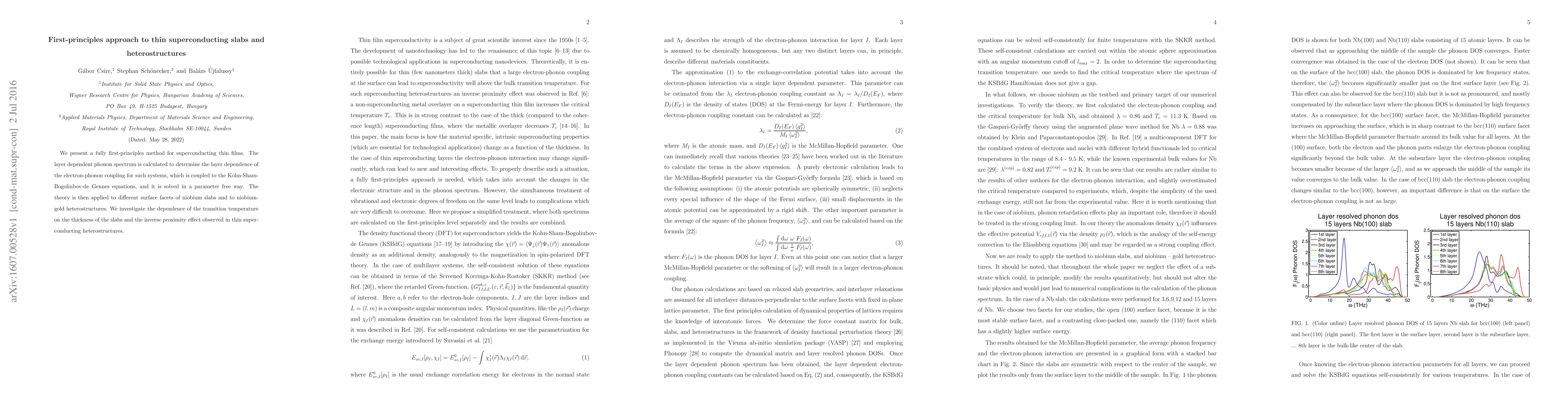 We present a fully first-principles method for superconducting thin films. The layer dependent phonon spectrum is calculated to determine the layer dependence of the electron-phonon coupling for such systems, which is coupled to the Kohn-Sham-Bogoliubov-de Gennes equations, and it is solved in a parameter free way. The theory is then applied to different surface facets of niobium slabs and to niobium-gold heterostructures. We investigate the dependence of the transition temperature on the thickness of the slabs and the inverse proximity effect observed in thin superconducting heterostructures.