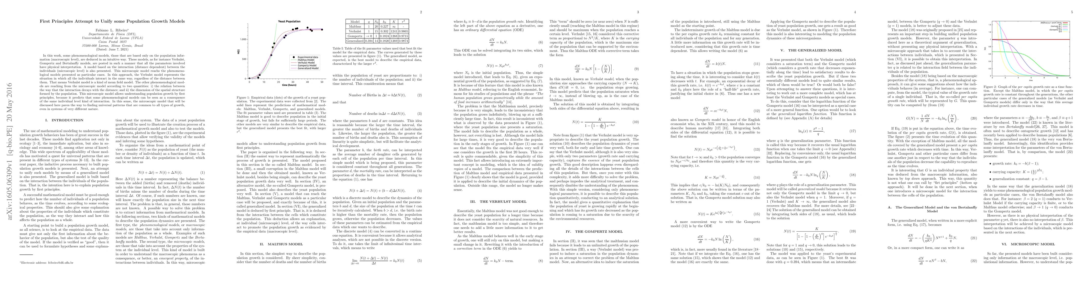 This paper deduces several phenomenological population growth models, such as Verhulst, Gompertz, and Bertalanffy, from first principles, showing their physical interpretations. It also introduces a microscopic model based on individual interactions, which encompasses the phenomenological models as specific cases.