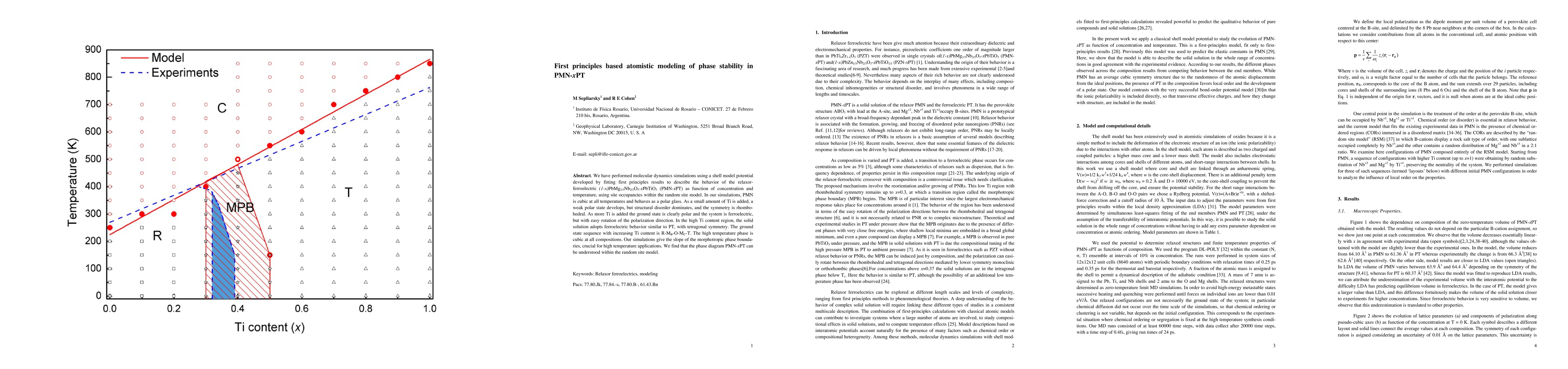 This paper uses first principles-based atomistic modeling and molecular dynamics simulations to study the phase stability of (1-x)PbMg1/3Nb2/3O3-xPbTiO3 (PMN-xPT). It finds that the material transitions from a cubic polar glass to a rhombohedral, then orthorhombic, and finally tetragonal ferroelectric state with increasing PbTiO3 content, crucial for high-temperature applications.