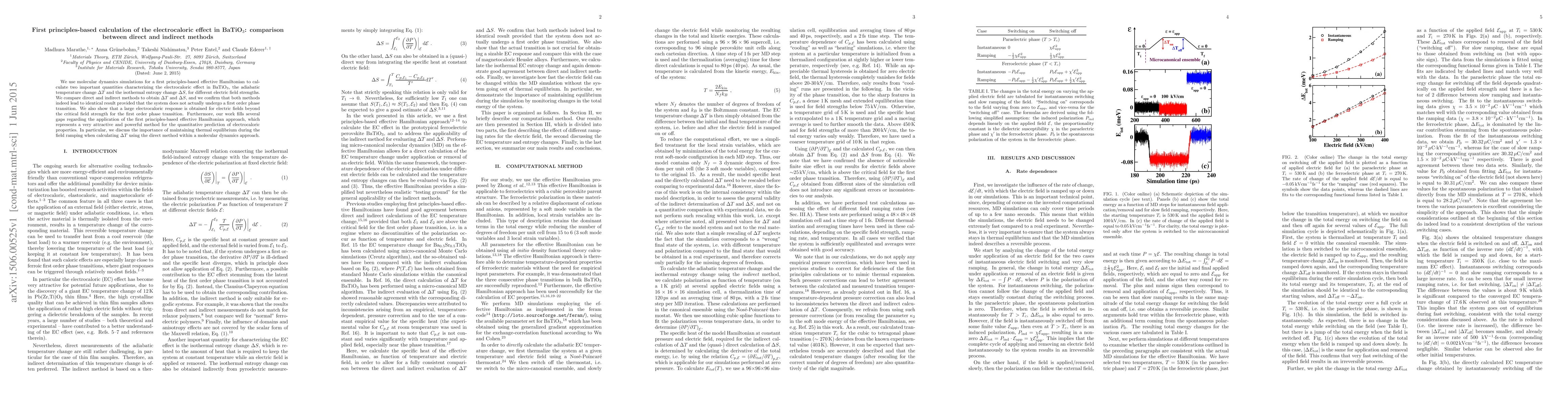This paper uses molecular dynamics simulations to calculate the electrocaloric effect in BaTiO$_3$ and compares direct and indirect methods for determining $\Delta T$ and $\Delta S$. The study confirms that both methods yield identical results unless a first-order phase transition occurs, and highlights the importance of thermal equilibrium during calculations.