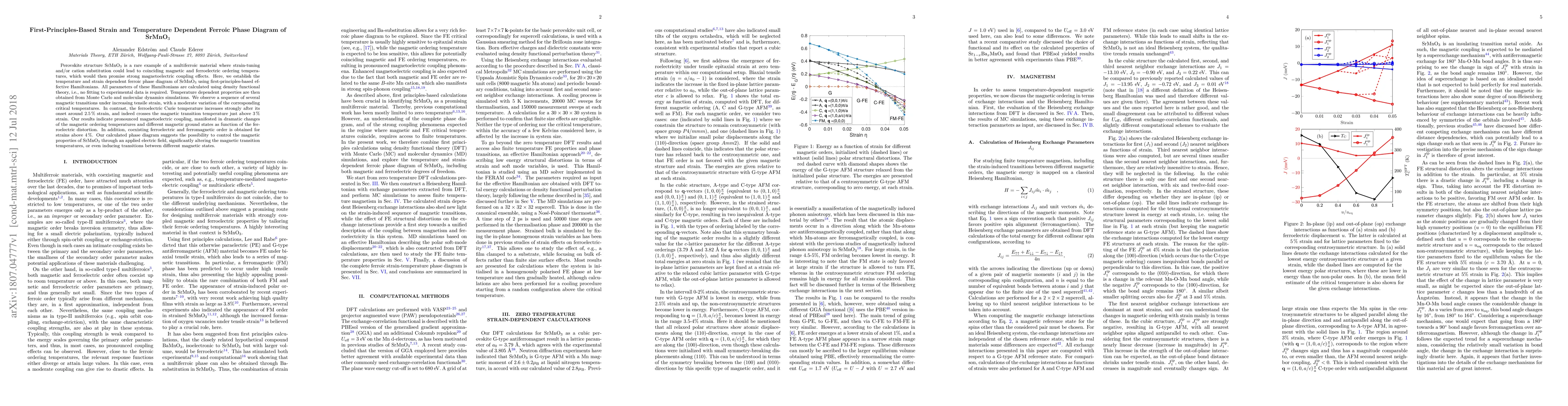 This study establishes a temperature and strain dependent ferroic phase diagram for SrMnO$_3$ using first-principles calculations and simulations. The research reveals significant magnetoelectric coupling, with strong variations in magnetic ordering temperatures and transitions between different magnetic states under applied strain.