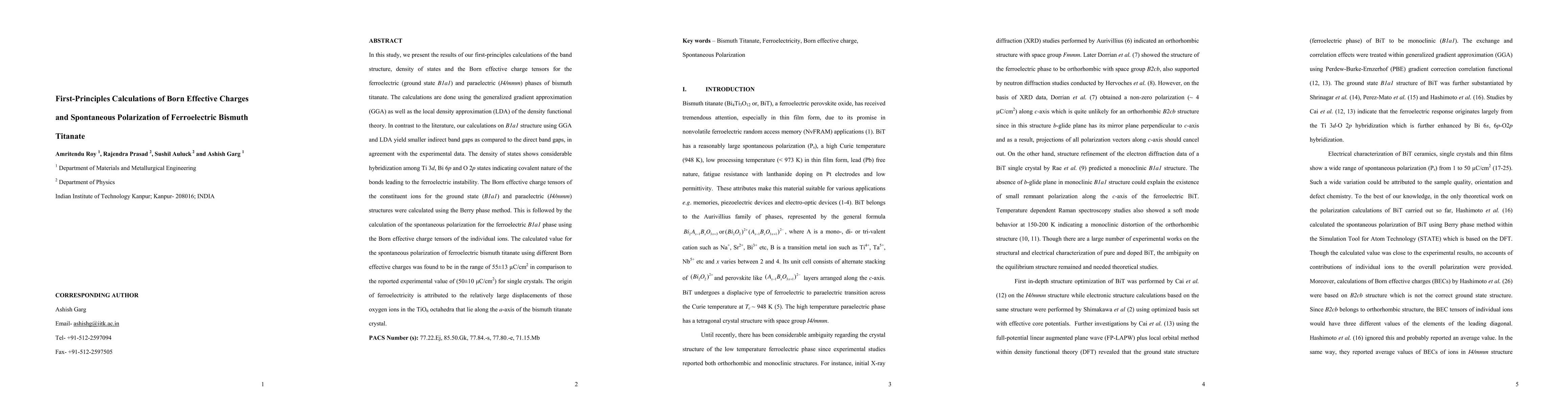 This study uses first-principles calculations to determine the band structure and Born effective charge tensors for ferroelectric and paraelectric bismuth titanate phases, revealing smaller indirect band gaps and considerable hybridization among Ti, Bi, and O states. The calculated spontaneous polarization aligns closely with experimental values, attributing ferroelectricity to oxygen displacements in TiO6 octahedra.