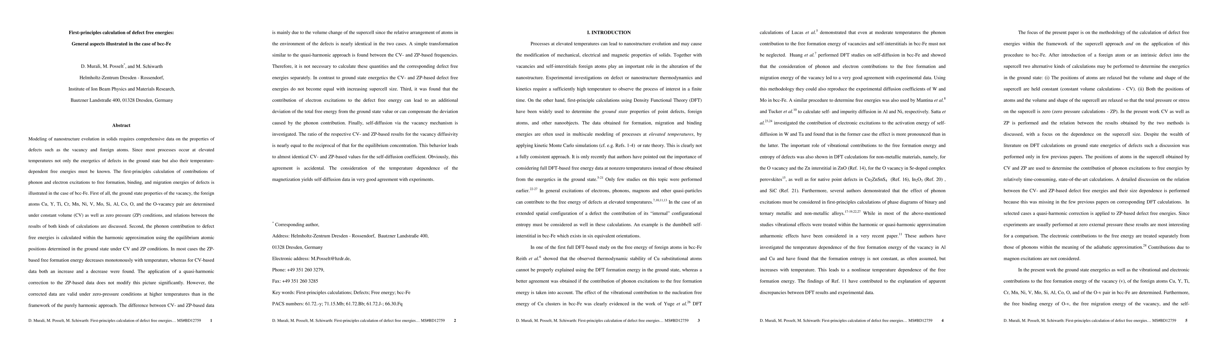 The first-principles calculation of contributions of phonon and electron excitations to free formation, binding, and migration energies of defects is illustrated in the case of bcc-Fe. First of all, the ground state properties of the vacancy, the foreign atoms Cu, Y, Ti, Cr, Mn, Ni, V, Mo, Si, Al, Co, O, and the O-vacancy pair are determined under constant volume (CV) as well as zero pressure (ZP) conditions. Second, the phonon contribution to defect free energies is calculated within the harmonic approximation using the equilibrium atomic positions determined in the ground state under CV and ZP conditions. Additionally, quasi-harmonic corrections are applied to the ZP-based data. A simple transformation similar to the quasi-harmonic approach is found between the CV- and ZP-based frequencies. Therefore, it is not necessary to calculate these quantities and the corresponding defect free energies separately. In contrast to ground state energetics the CV- and ZP-based defect free energies do not become equal with increasing supercell size. Third, it was found that the contribution of electron excitations to the defect free energy can lead to an additional deviation of the total free energy from the ground state value or can compensate the deviation caused by the phonon contribution. Finally, self-diffusion via the vacancy mechanism is investigated. The ratio of the respective CV- and ZP-based results for the vacancy diffusivity is nearly equal to the reciprocal of that for the equilibrium concentration. This behaviour leads to almost identical CV- and ZP-based values for the self-diffusion coefficient. Obviously, this agreement is accidental. The consideration of the temperature dependence of the magnetization yields self-diffusion data in very good agreement with experiments.
