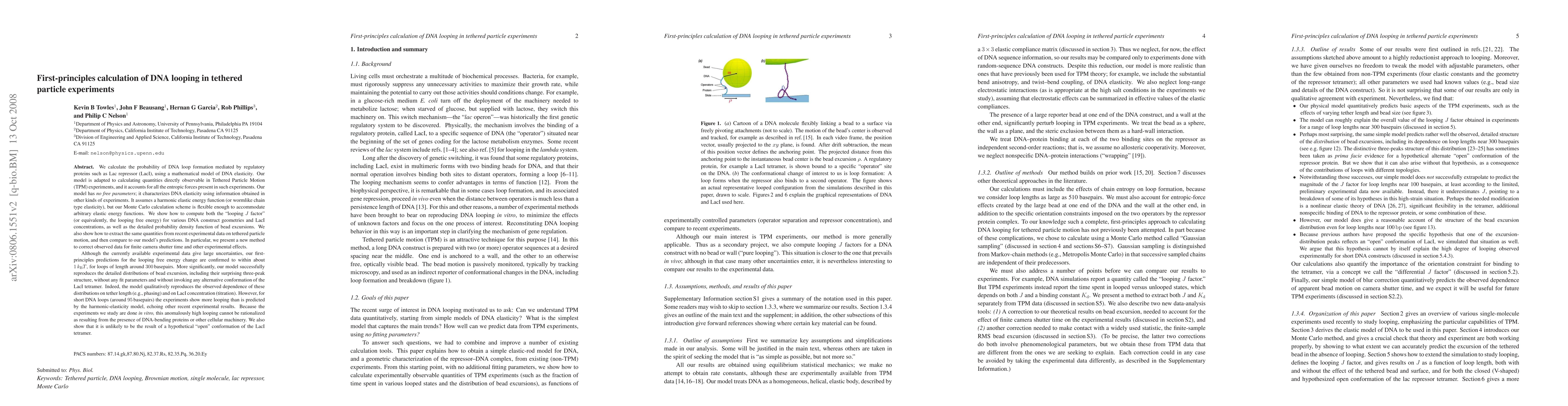 This study presents a first-principles model to calculate DNA loop formation probabilities mediated by regulatory proteins, specifically Lac repressor, using DNA elasticity data from other experiments. The model accurately reproduces observed tethered particle motion data without free parameters, including a three-peak structure in bead excursion distributions, but underpredicts looping for short DNA lengths, suggesting unaccounted in vitro dynamics.