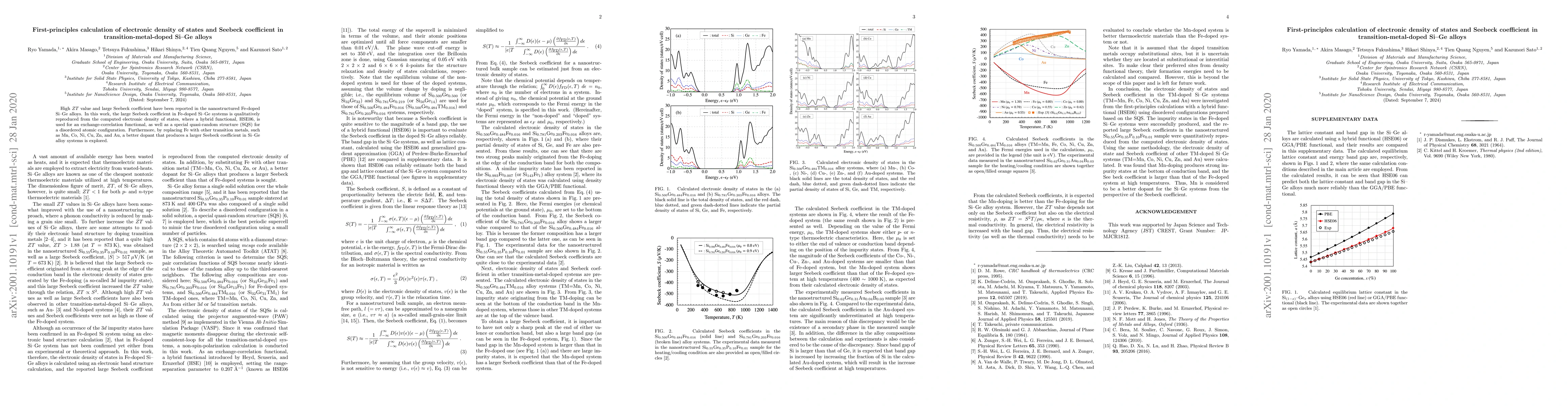 High $ZT$ value and large Seebeck coefficient have been reported in the nanostructured Fe-doped Si-Ge alloys. In this work, the large Seebeck coefficient in Fe-doped Si-Ge systems is qualitatively reproduced from the computed electronic density of states, where a hybrid functional, HSE06, is used for an exchange-correlation functional, as well as a special quasi-random structure (SQS) for a disordered atomic configuration. Furthermore, by replacing Fe with other transition metals, such as Mn, Co, Ni, Cu, Zn, and Au, a better dopant that produces a larger Seebeck coefficient in Si-Ge alloy systems is explored.