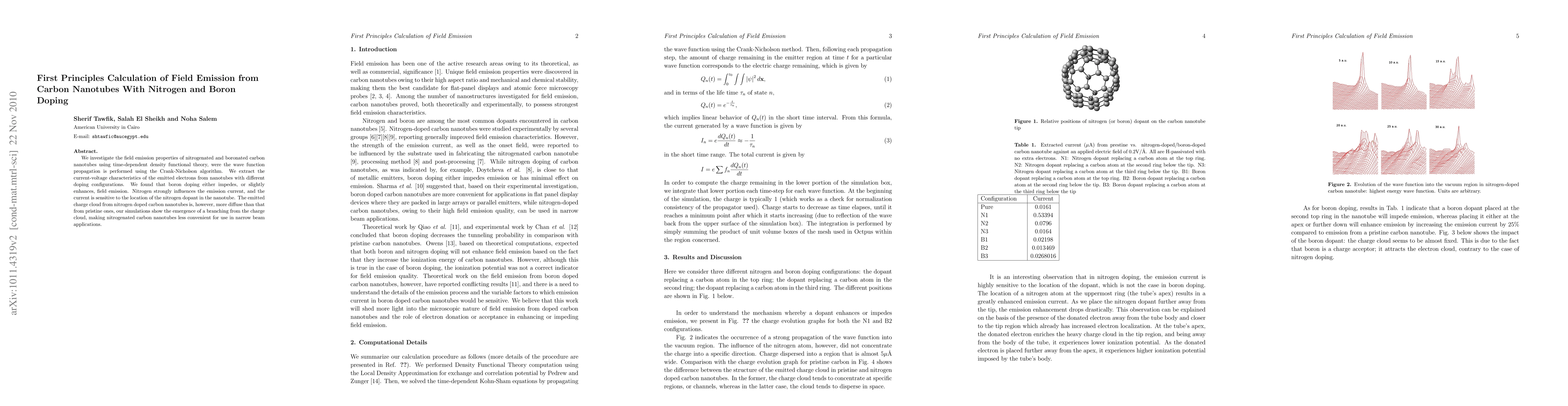 This study employs time-dependent density functional theory to examine field emission from nitrogen and boron doped carbon nanotubes, revealing that boron has a negligible effect on emission while nitrogen significantly influences it, leading to a more diffuse emitted charge cloud and branching, making it less suitable for narrow beam applications.