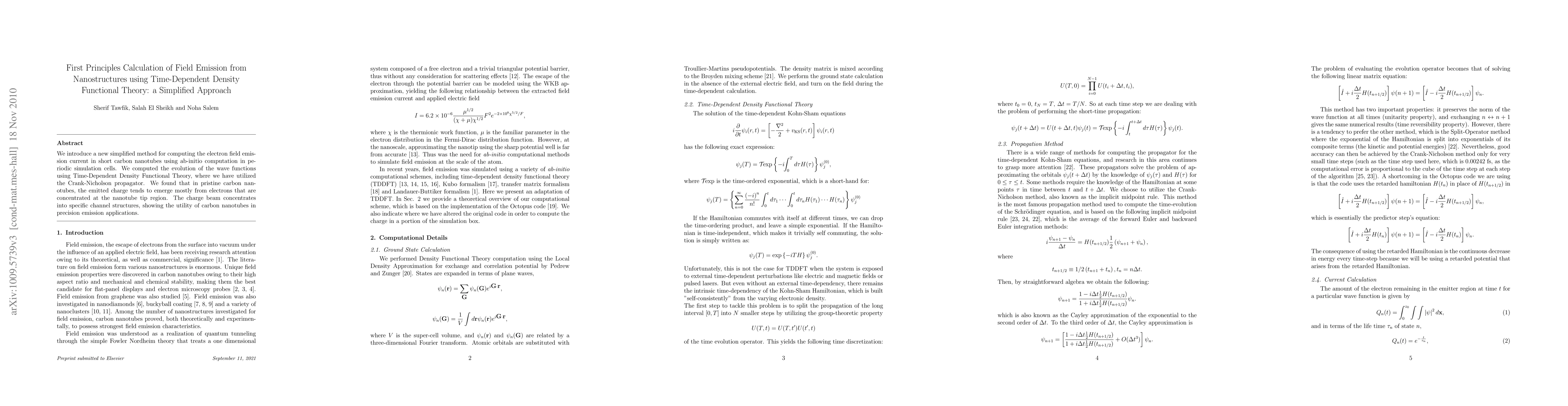 We introduce a new simplified method for computing the electron field emission current in short carbon nanotubes using ab-initio computation in periodic simulation cells. We computed the evolution of the wave functions using Time-Dependent Density Functional Theory, where we have utilized the Crank-Nicholson propagator. We found that in pristine carbon nanotubes, the emitted charge tends to emerge mostly from electrons that are concentrated at the nanotube tip region. The charge beam concentrates into specific channel structures, showing the utility of carbon nanotubes in precision emission applications.