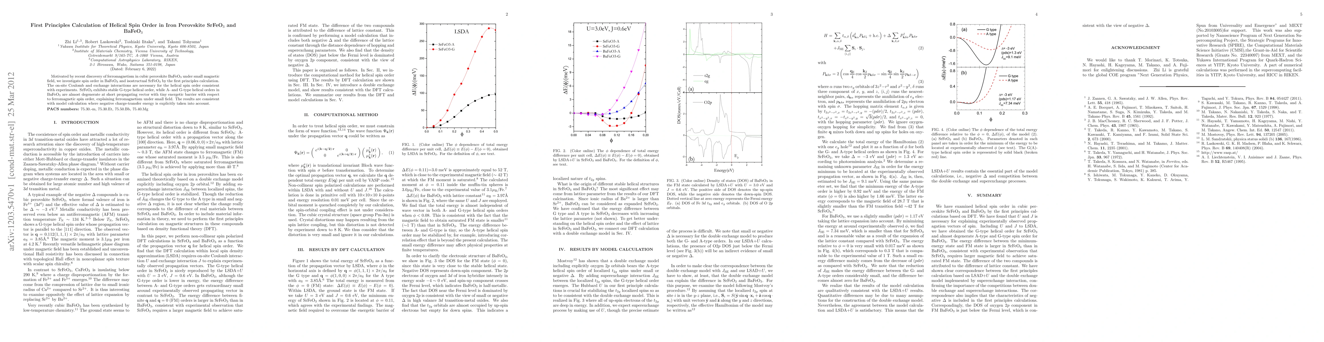 Motivated by recent discovery of ferromagnetism in cubic perovskite BaFeO3 under small magnetic field, we investigate spin order in BaFeO3 and isostructual SrFeO3 by the first principles calculation. The on-site Coulomb and exchange interactions are necessary for the helical spin order consistent with experiments. SrFeO3 exhibits stable G-type helical order, while A- and G-type helical orders in BaFeO3 are almost degenerate at short propagating vector with tiny energetic barrier with respect to ferromagnetic spin order, explaining ferromagnetism under small field. The results are consistent with model calculation where negative charge-transfer energy is explicitly taken into account.