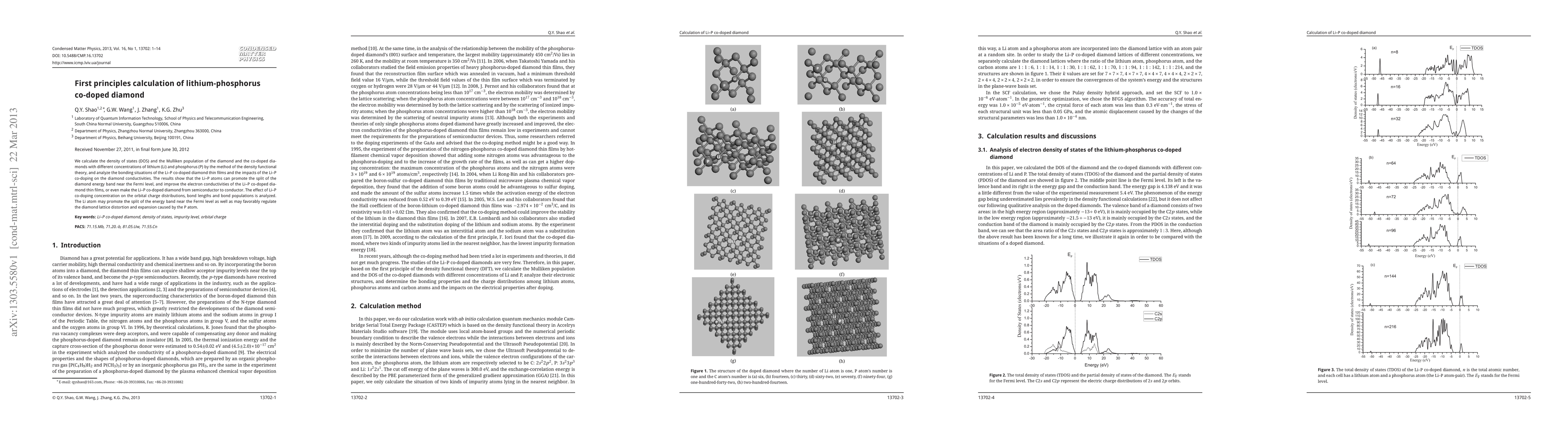 This study uses density functional theory to investigate the effects of lithium-phosphorus co-doping on diamond's electronic properties, finding that it enhances electron conductivity and can transform diamond from a semiconductor to a conductor. The Li atom helps regulate lattice distortions caused by P doping.