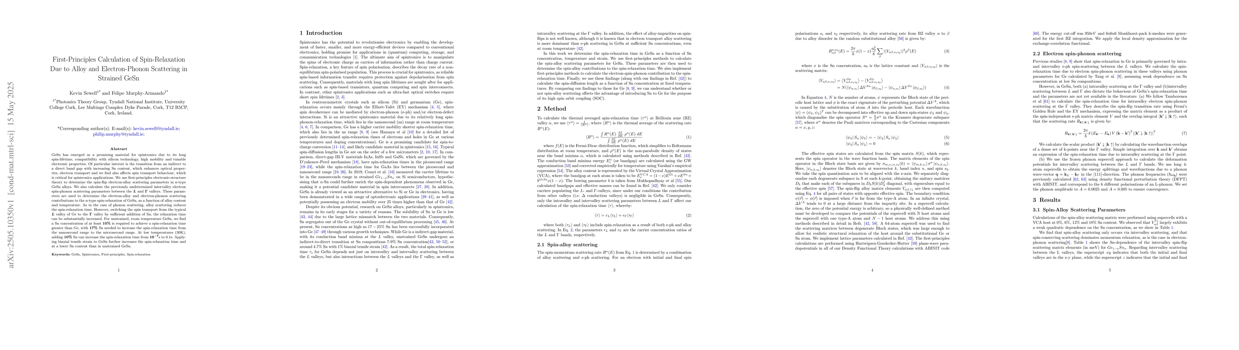 The paper presents first-principles calculations of spin-flip electron-alloy scattering parameters and intervalley electron spin-phonon scattering parameters, providing a detailed understanding of spin-relaxation mechanisms in strained GeSn.