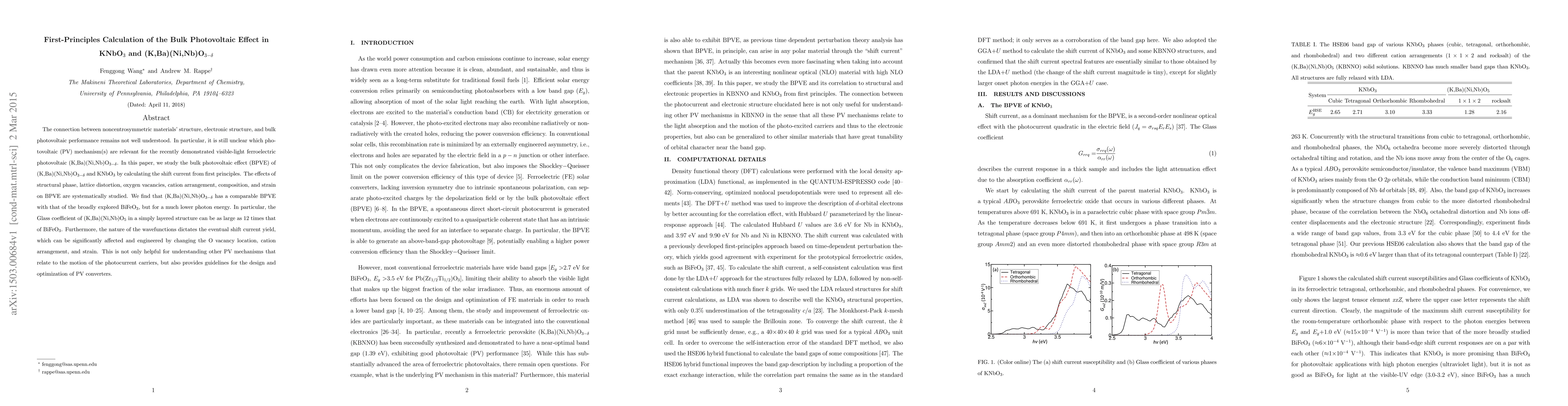 This paper investigates the bulk photovoltaic effect (BPVE) in KNbO₃ and (K,Ba)(Ni,Nb)O₃₋δ using first-principles calculations, revealing that (K,Ba)(Ni,Nb)O₃₋δ exhibits a comparable BPVE to BiFeO₃ but at lower photon energies, with significant potential for PV optimization. The study highlights the influence of structural factors on the shift current and provides insights for designing efficient photovoltaic materials.