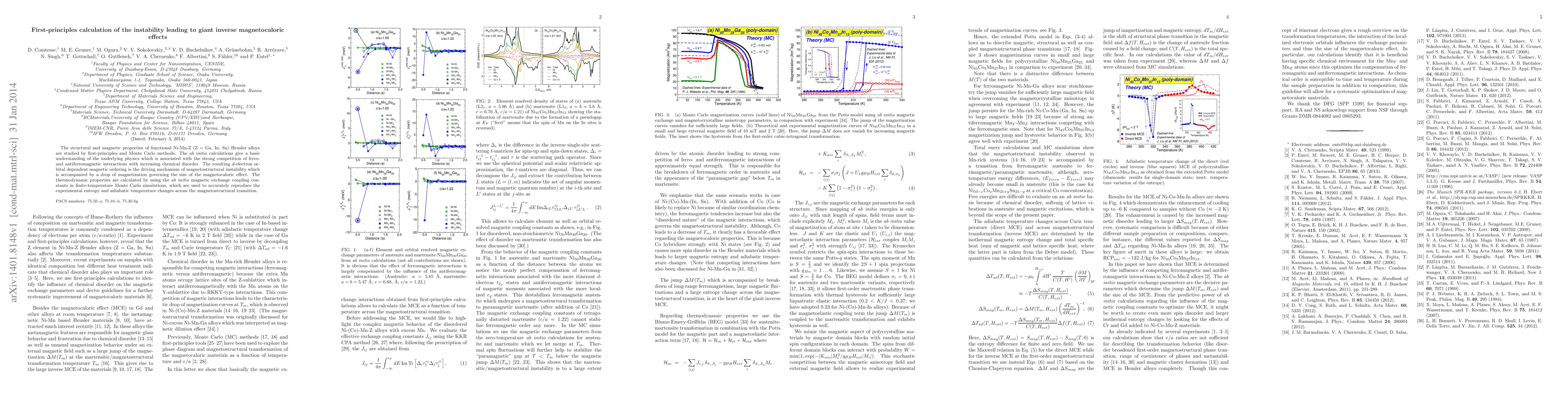The structural and magnetic properties of functional Ni-Mn-Z (Z = Ga, In, Sn) Heusler alloys are studied by first-principles and Monte Carlo methods. The \textit{ab initio} calculations give a basic understanding of the underlying physics which is associated with the strong competition of ferro- and antiferromagnetic interactions with increasing chemical disorder. The resulting $d$-electron orbital dependent magnetic ordering is the driving mechanism of magnetostructural instability which is accompanied by a drop of magnetization governing the size of the magnetocaloric effect. The thermodynamic properties are calculated by using the \textit{ab initio} magnetic exchange coupling constants in finite-temperature Monte Carlo simulations, which are used to accurately reproduce the experimental entropy and adiabatic temperature changes across the magnetostructural transition.