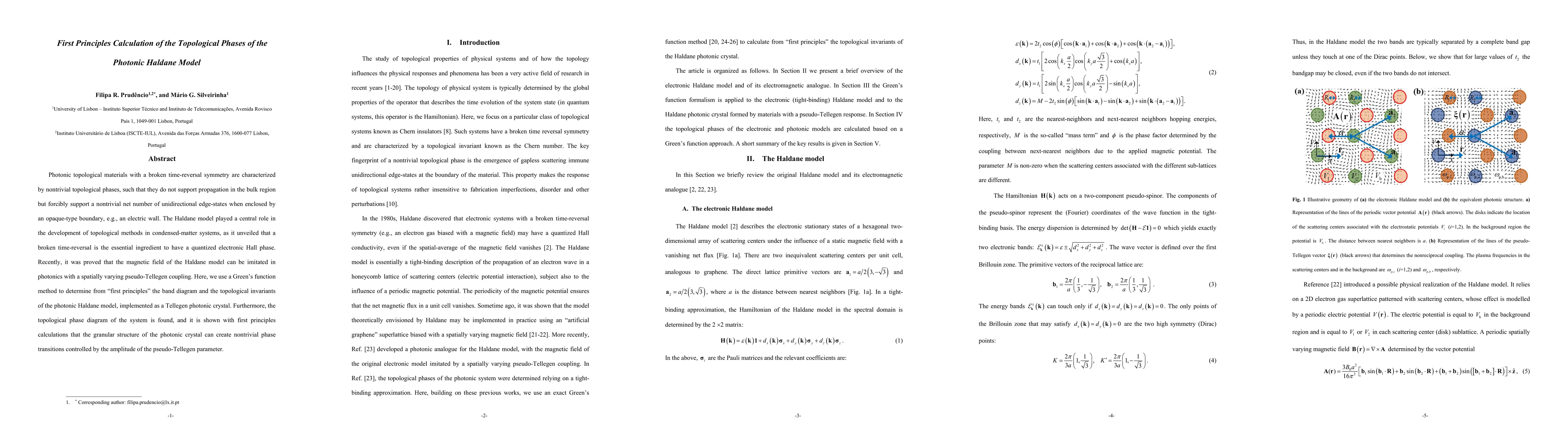 Photonic topological materials with a broken time reversal symmetry are characterized by nontrivial topological phases, such that they do not support propagation in the bulk region but forcibly support a nontrivial net number of unidirectional edge states when enclosed by an opaque type boundary, e.g., an electric wall. The Haldane model played a central role in the development of topological methods in condensed matter systems, as it unveiled that a broken time reversal is the essential ingredient to have a quantized electronic Hall phase. Recently, it was proved that the magnetic field of the Haldane model can be imitated in photonics with a spatially varying pseudo Tellegen coupling. Here, we use a Greens function method to determine from first principles the band diagram and the topological invariants of the photonic Haldane model, implemented as a Tellegen photonic crystal. Furthermore, the topological phase diagram of the system is found, and it is shown with first principles calculations that the granular structure of the photonic crystal can create nontrivial phase transitions controlled by the amplitude of the pseudo Tellegen parameter.