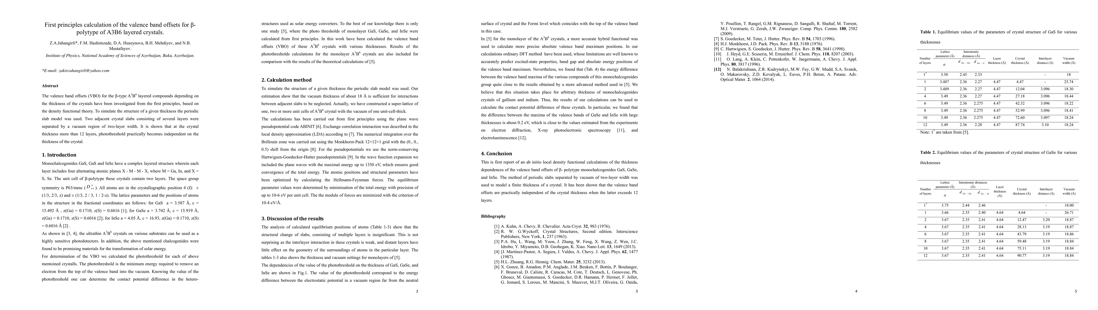 The valence band offsets (VBO) for the \b{eta}-type A3B6 layered compounds depending on the thickness of the crystals have been investigated from the first principles, based on the density functional theory. To simulate the structure of a given thickness the periodic slab model was used. Two adjacent crystal slabs consisting of several layers were separated by a vacuum region of two-layer width. It is shown that at the crystal thickness more than 12 layers, photothreshold practically becomes independent on the thickness of the crystal.