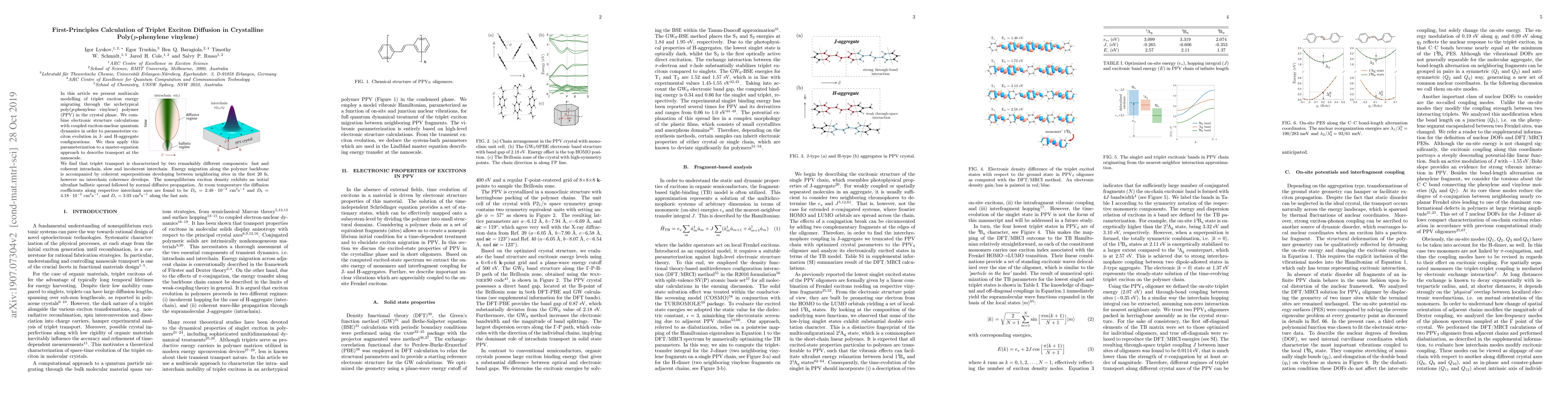 Understanding and controlling exciton transport is a strategic way to enhance the optoelectronic properties of high-performance organic devices. In this article we study triplet exciton migration in crystalline poly($p$-phenylene vinylene) polymer (PPV) using comprehensive electronic structure and quantum dynamical methods. We solve the coupled electron-nuclear dynamics for the triplet energy migrating between two neighboring Frenkel sites in J- and H-aggregate arrangements. From the two-site model we extract key parameters for use with a master-equation approach that allows us to treat nanosize systems where time-dependent Schr\"odinger equation becomes intractable. We calculate the transient exciton density evolution and determine the diffusion constants along the principal crystal axes of the PPV. The triplet diffusion is characterized by two distinctive components: fast intrachain, and slow interchain. At room temperature the interchain diffusion coefficients are found to be $D_a=0.89\cdot10^{-2}$ cm$^2$s$^{-1}$ and $D_b=1.49\cdot10^{-2}$ cm$^2$s$^{-1}$ along the respective $\bar{a}$- and $\bar{b}$-axes, and the intrachain is $D_c=3.03$ cm$^2$s$^{-1}$ along the fast $\bar{c}$-axis. The exceptionally high exciton mobility along the $\pi$-conjugated backbone facilitates rapid triplet migration over long distances. Our results can be utilized in the design of efficient energy conversion and light-emitting devices with desired solid-state properties.