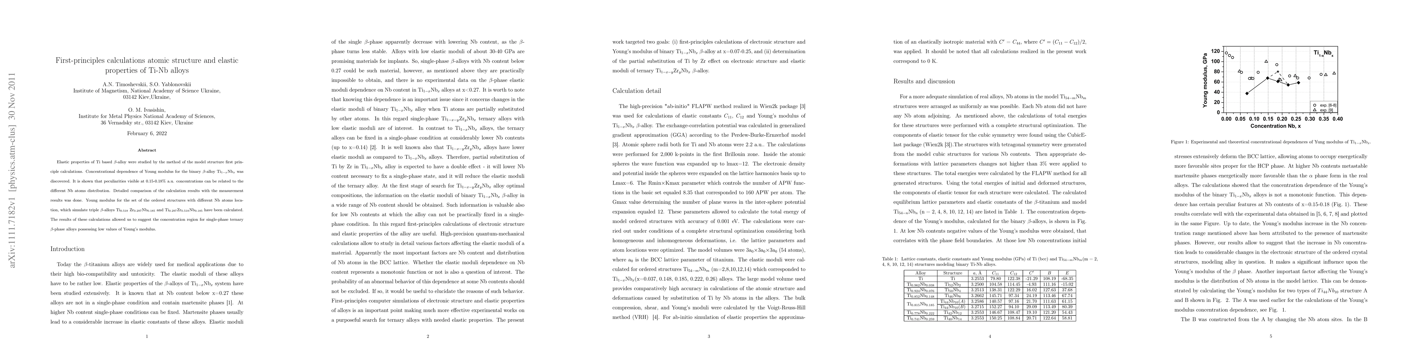 This paper uses first-principles calculations to investigate the elastic properties of Ti-Nb alloys, finding concentrational dependence of the Young modulus linked to Nb atom distribution. It identifies a concentration region in ternary Ti-Zr-Nb alloys for single-phase β-phase with low Young's modulus.