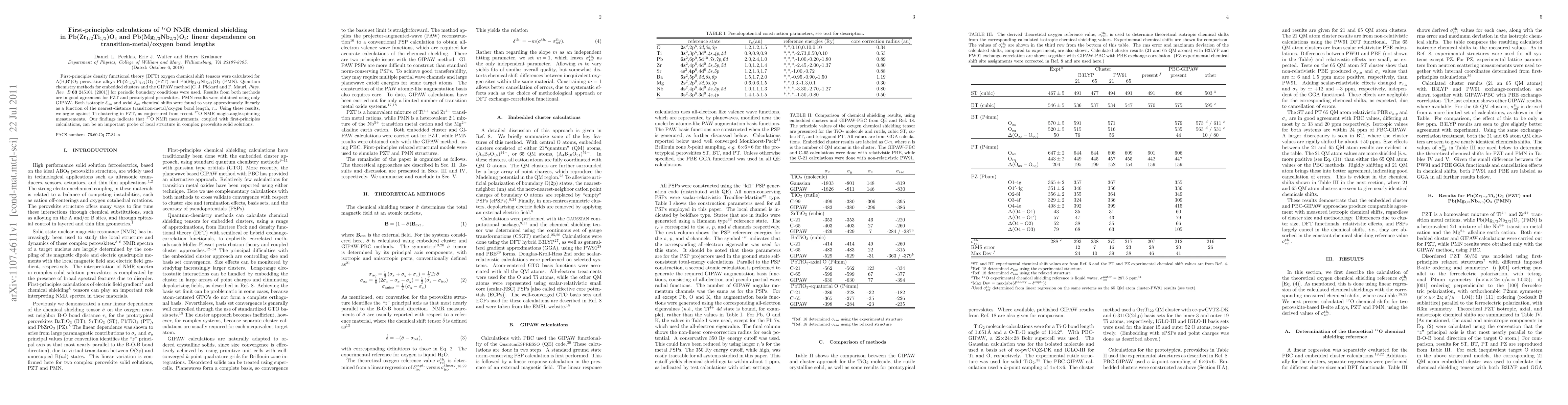 Researchers used first-principles calculations to study $^{17}$O NMR chemical shielding in perovskite alloys Pb(Zr$_{1/2}$Ti$_{1/2}$)O$_3$ and Pb(Mg$_{1/3}$Nb$_{2/3}$)O$_3$, finding a linear relationship between chemical shift and bond length. The findings contradict previous NMR magic-angle-spinning measurements.