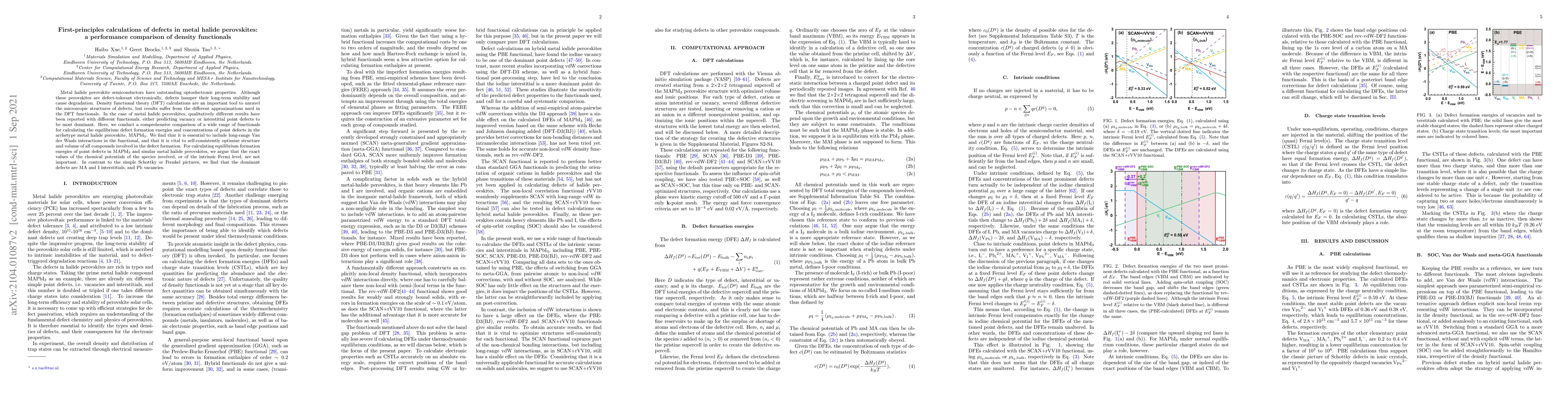 This paper provides a comprehensive comparison of various density functionals for calculating defect formation energies in MAPbI$_3$, highlighting the importance of including long-range Van der Waals interactions and self-consistent structural optimization. The study finds that MA and I interstitials, along with Pb vacancies, are the dominant defects, challenging simpler defect models.