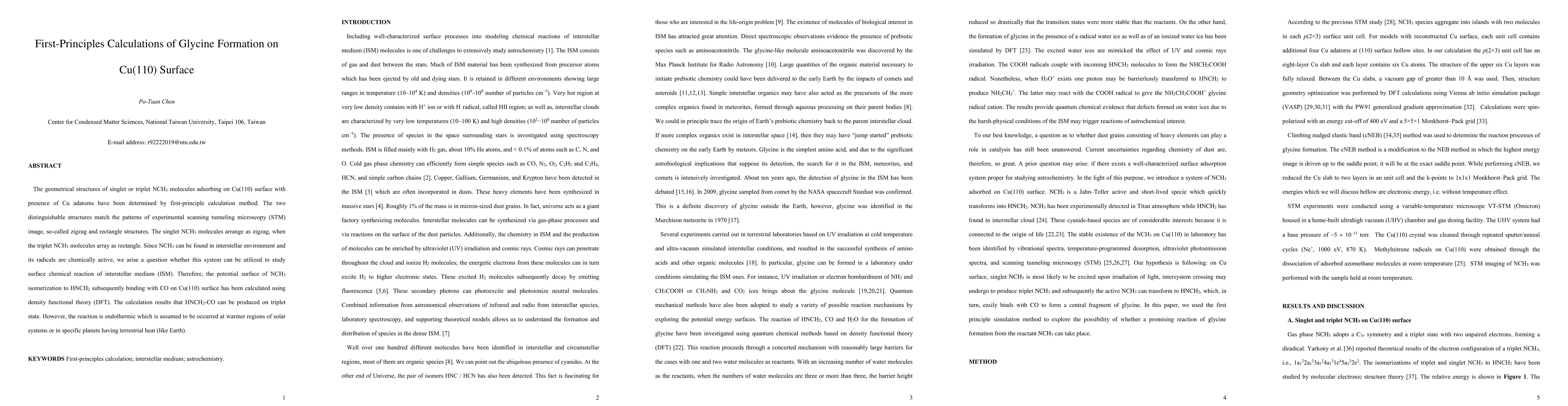 Researchers used first-principle calculations to study glycine formation on a copper surface, finding two stable structures that match experimental images. They also calculated the potential reaction of glycine with CO on the surface, which could occur in warmer regions or specific planets.