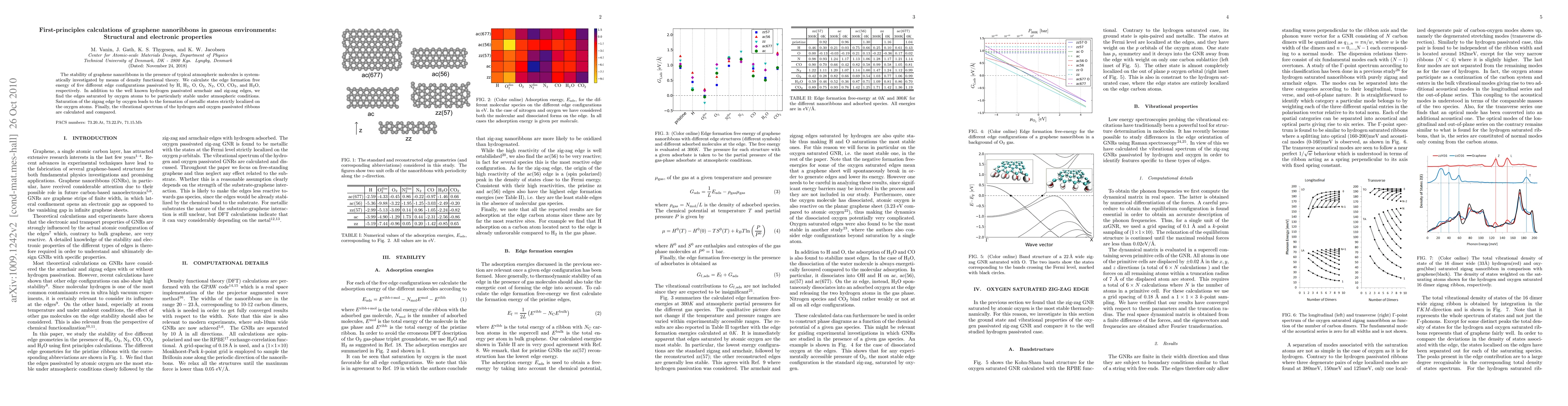 This paper investigates the stability and electronic properties of graphene nanoribbons exposed to atmospheric molecules using density functional theory. It finds that oxygen-passivated zig-zag edges are particularly stable and induce metallic states localized on oxygen atoms, while comparing the vibrational spectra of hydrogen and oxygen passivated ribbons.