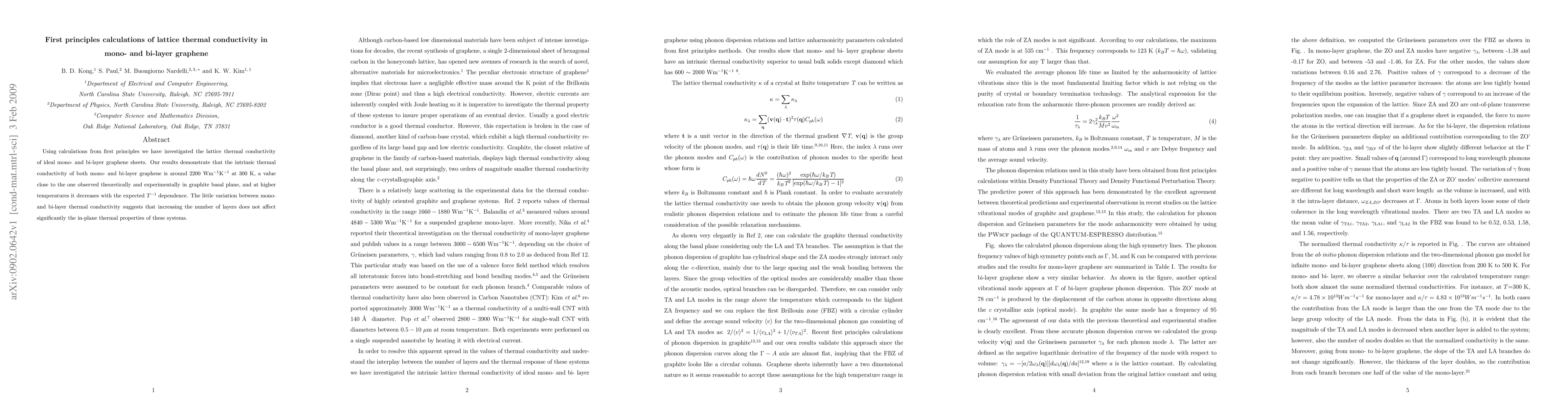This study uses first principles calculations to determine that the intrinsic lattice thermal conductivity of both mono- and bi-layer graphene is approximately 2200 W/mK at 300 K, with a decrease following a 1/T trend at higher temperatures. The minimal difference in thermal conductivity between mono- and bi-layer graphene indicates that additional layers have little impact on their in-plane thermal properties.