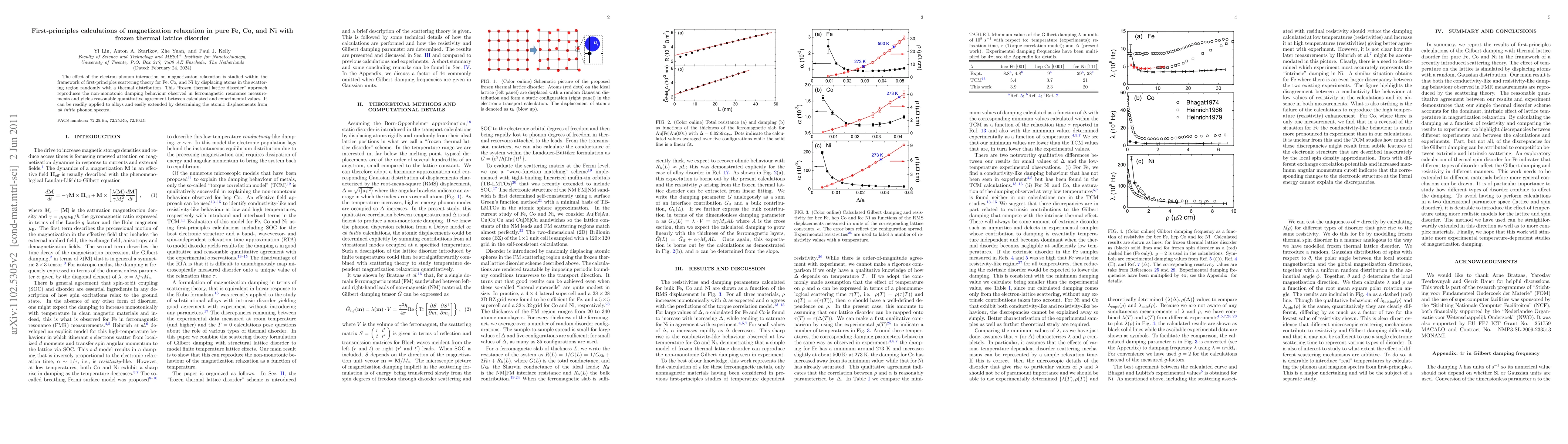 This study uses first-principles calculations to analyze magnetization relaxation in Fe, Co, and Ni under "frozen thermal lattice disorder," revealing electron-phonon interaction effects and matching experimental damping behavior. The approach can be applied to alloys and extended using ab initio phonon spectra.