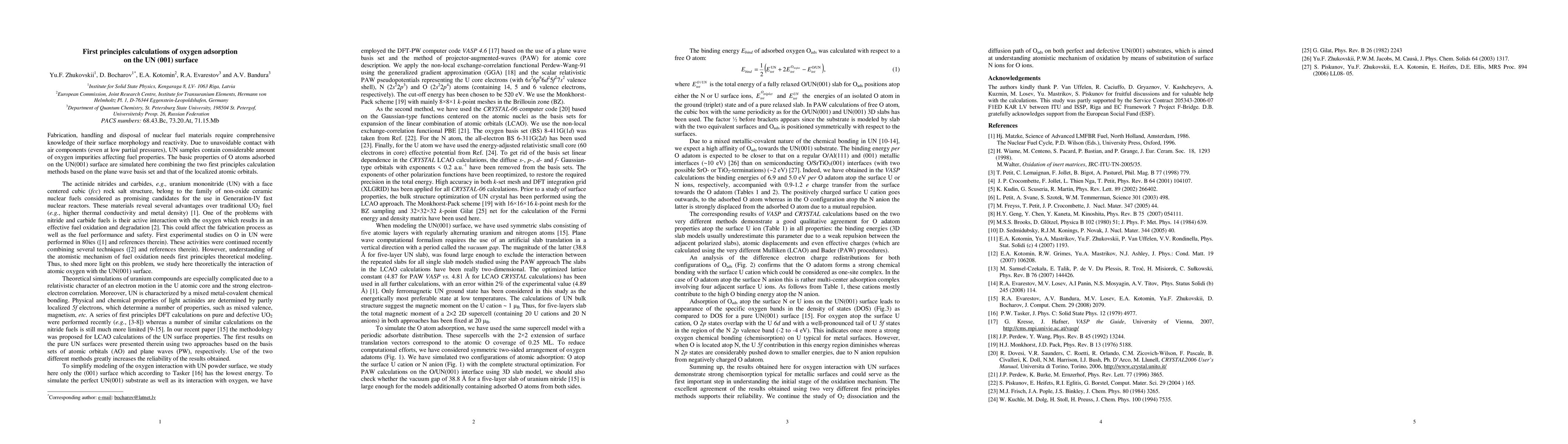 Summary: This study uses first principles calculations to simulate oxygen adsorption on the UN(001) surface, focusing on the effects of oxygen impurities on nuclear fuel properties, utilizing both plane wave basis set and localized atomic orbital methods for comprehensive analysis.