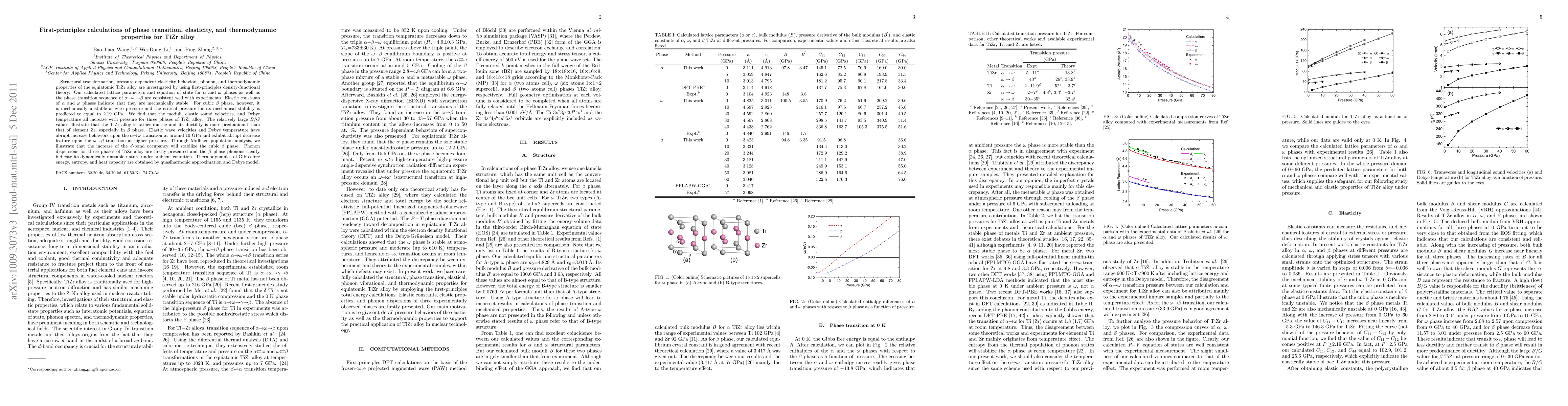 tructural transformation, pressure dependent elasticity behaviors, phonon, and thermodynamic properties of the equiatomic TiZr alloy are investigated by using first-principles density-functional theory. Our calculated lattice parameters and equation of state for $\alpha$ and $\omega$ phases as well as the phase transition sequence of $\alpha$$\mathtt{\rightarrow}$$\omega$$\mathtt{\rightarrow}$$\beta$ are consistent well with experiments. Elastic constants of $\alpha$ and $\omega$ phases indicate that they are mechanically stable. For cubic $\beta$ phase, however, it is mechanically unstable at zero pressure and the critical pressure for its mechanical stability is predicted to equal to 2.19 GPa. We find that the moduli, elastic sound velocities, and Debye temperature all increase with pressure for three phases of TiZr alloy. The relatively large $B/G$ values illustrate that the TiZr alloy is rather ductile and its ductility is more predominant than that of element Zr, especially in $\beta$ phase. Elastic wave velocities and Debye temperature have abrupt increase behaviors upon the $\alpha$$\mathtt{\rightarrow}$$\omega$ transition at around 10 GPa and exhibit abrupt decrease feature upon the $\omega$$\mathtt{\rightarrow}$$\beta$ transition at higher pressure. Through Mulliken population analysis, we illustrate that the increase of the \emph{d}-band occupancy will stabilize the cubic $\beta$ phase. Phonon dispersions for three phases of TiZr alloy are firstly presented and the $\beta$ phase phonons clearly indicate its dynamically unstable nature under ambient condition. Thermodynamics of Gibbs free energy, entropy, and heat capacity are obtained by quasiharmonic approximation and Debye model.