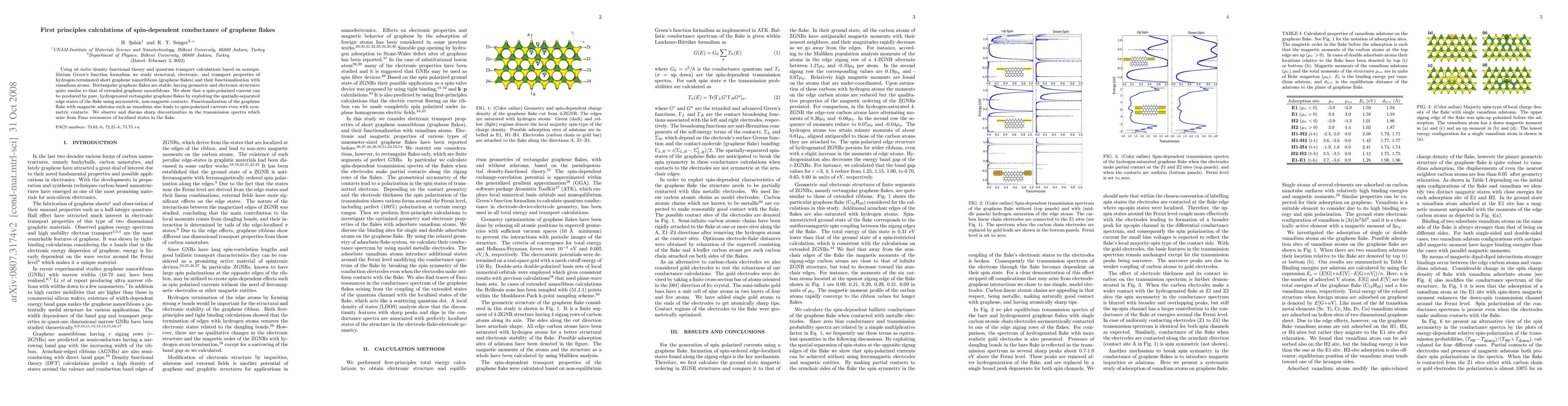 Summary: This study employs ab initio calculations to investigate spin-dependent conductance in hydrogen-terminated graphene flakes, revealing that spin-polarized currents can be generated through spatially-separated edge states and further enhanced by the presence of magnetic adatoms like vanadium, resulting in Fano resonances.